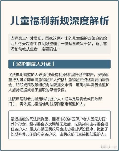 4月1日起施行!两部新规护航未成年人,保护再升级 家长们注意啦!民政部最新发布,两部未成年人保护新规将于2026年4月1日正式落地,全方位压实收留救助责任,给孩子更坚实的守护。 新修订的《儿童福利机构管理办法》明确,机构主要收留抚养孤儿、查找不到生父母的儿童,规范接收至离院全流程;鼓励“开门办院”,为病残、孤独症儿童提供康复服务,同时为家长开展照护培训;机构需严守消防、应急、档案等安全管理制度。 新制定的《未成年人救助保护机构管理暂行办法》,细化临时监护职责,覆盖遗弃、打拐解救等需临时监护的未成年人。机构必须提供健康检查、心理辅导、教育、寻亲等服务;同时延伸关爱,为机构外困境儿童开展危机干预,并培训儿童督导员与儿童主任。 两项新规将“儿童优先”落到实处,补齐长期监护与临时监护短板,服务更专业、管理更严格,标志着我国未成年人保护迈入规范化、精细化新阶段。 关爱留守儿童 儿童福利