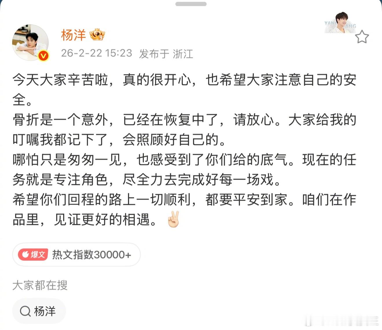 杨洋再度回应《不让江山》争议:手部恢复很好,是我喜欢的新剧与角色,拜托大家一起爱护。
