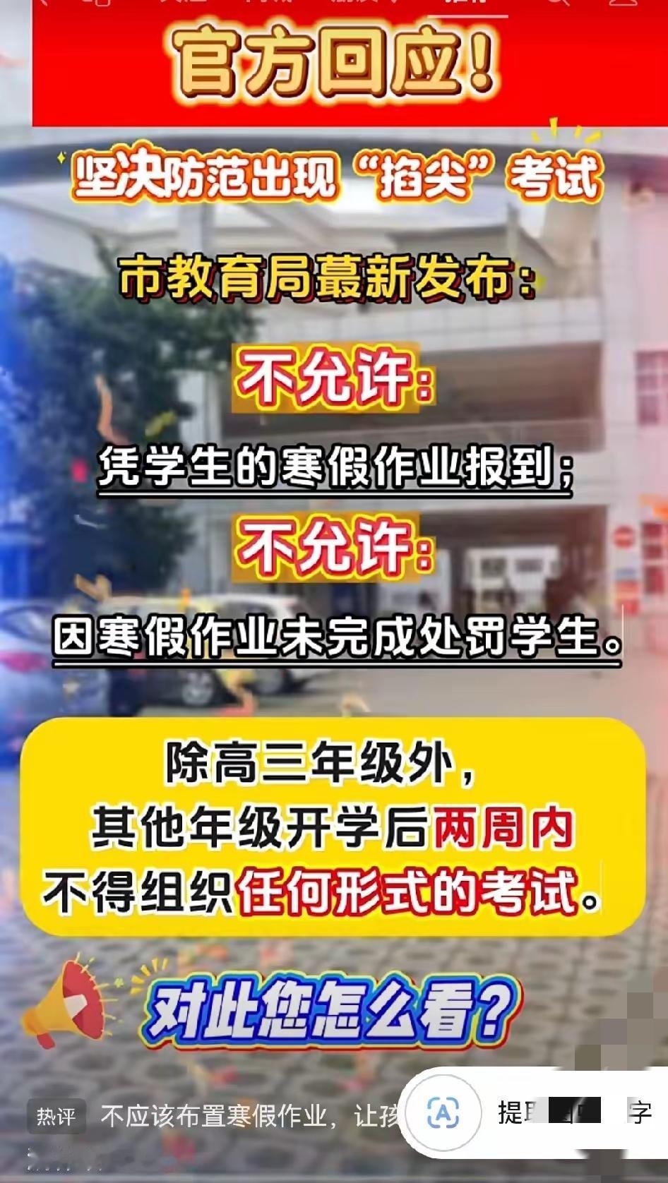 教育局新规一出,家长们直接炸锅:不许凭作业报到、 不许罚未完成作业的学生,那寒假作业还有意义吗? 其实这不是取消作业,而是给孩子松绑,不让开学变成“批斗大会”。 假期本来是休息和查漏补缺的时间,不该被机械作业和焦虑绑架。有的家长支持彻底取消,让孩子自主安排;也有人担心,不盯作业会影响升学。 在我看来,寒假作业可以有,但要减量提质,少些重复刷题,多些实践与阅读。教育的目的不是逼孩子赶作业,而是让他们愿意学、学得轻松。 你支持取消中小学寒假作业吗?