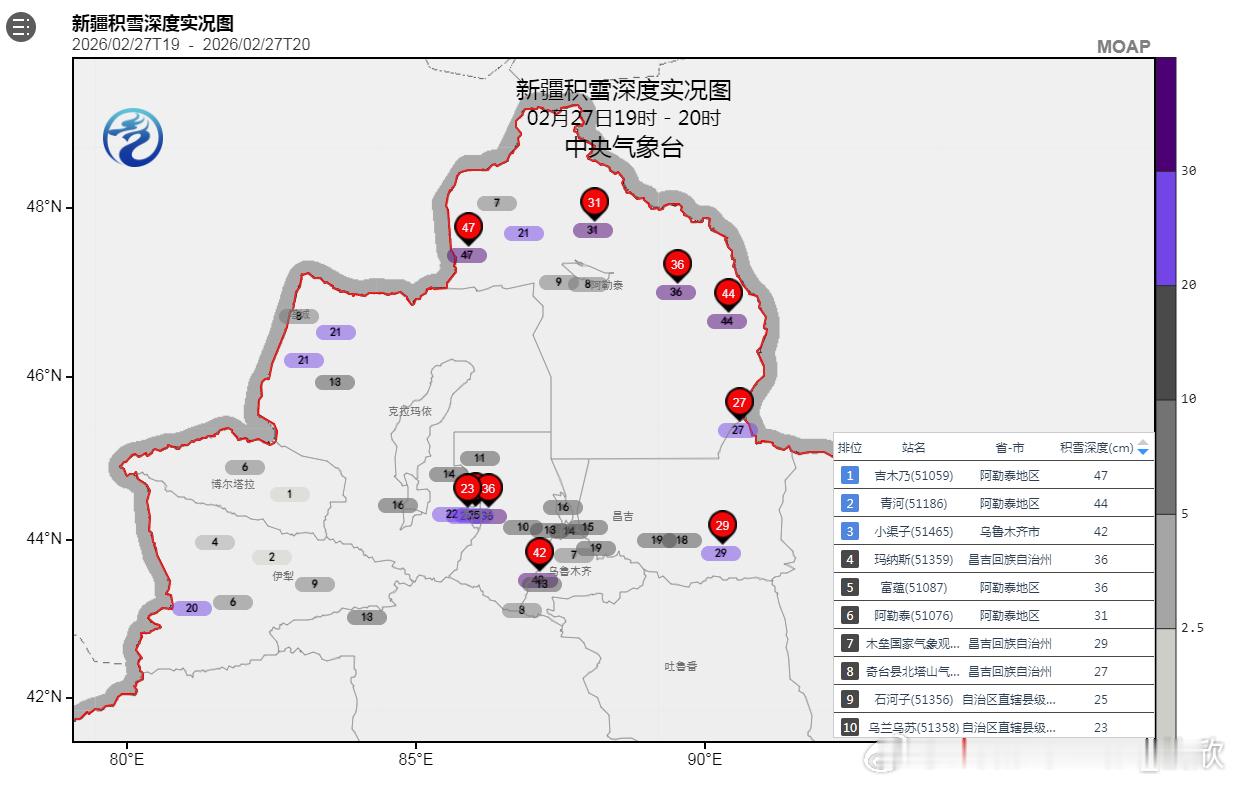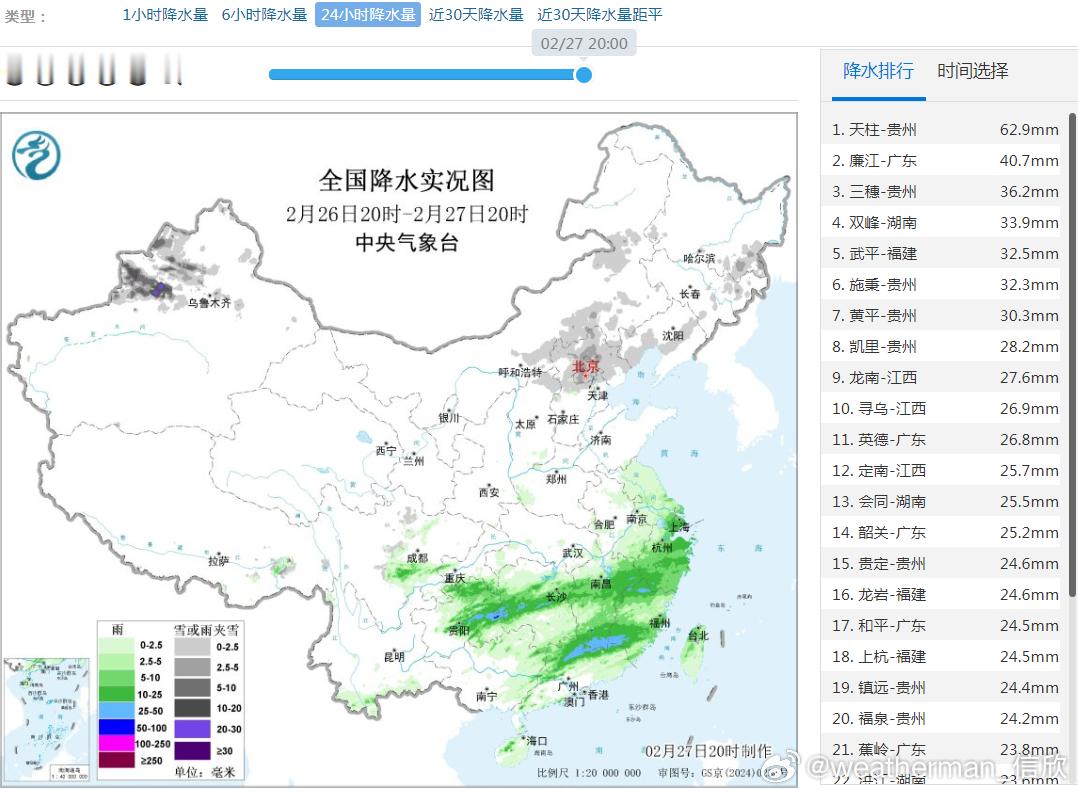 【中东部雨雪频繁】昨晚到今天,南方出现大范围降雨,贵州东部的天柱出现了暴雨。新疆西部、华北等地出现降雪。新疆伊犁河谷-天山附近局地出现暴雪。今晚20时积雪,昭苏20厘米、新源9厘米、巴音布鲁克13厘米。今晚到明天,新疆天山附近还有强降雪,之后2天逐渐减弱。中东部因为冷暖气流交汇,有大范围雨雪,3月1日南方降雨最强,而北方部分地区降雪分布和强度,存在变数。