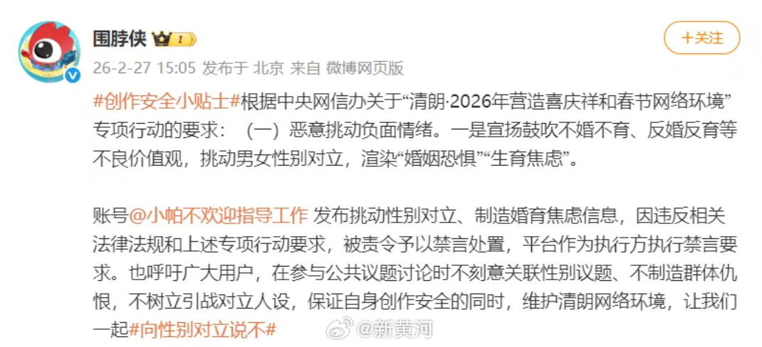 【#脱口秀演员因挑动性别对立被禁言# 】27日,账号发文:根据中央网信办关于“清朗·2026年营造喜庆祥和春节网络环境”专项行动的要求:(一)恶意挑动负面情绪。一是宣扬鼓吹不婚不育、反婚反育等不良价值观,挑动男女性别对立,渲染“婚姻恐惧”“生育焦虑”。