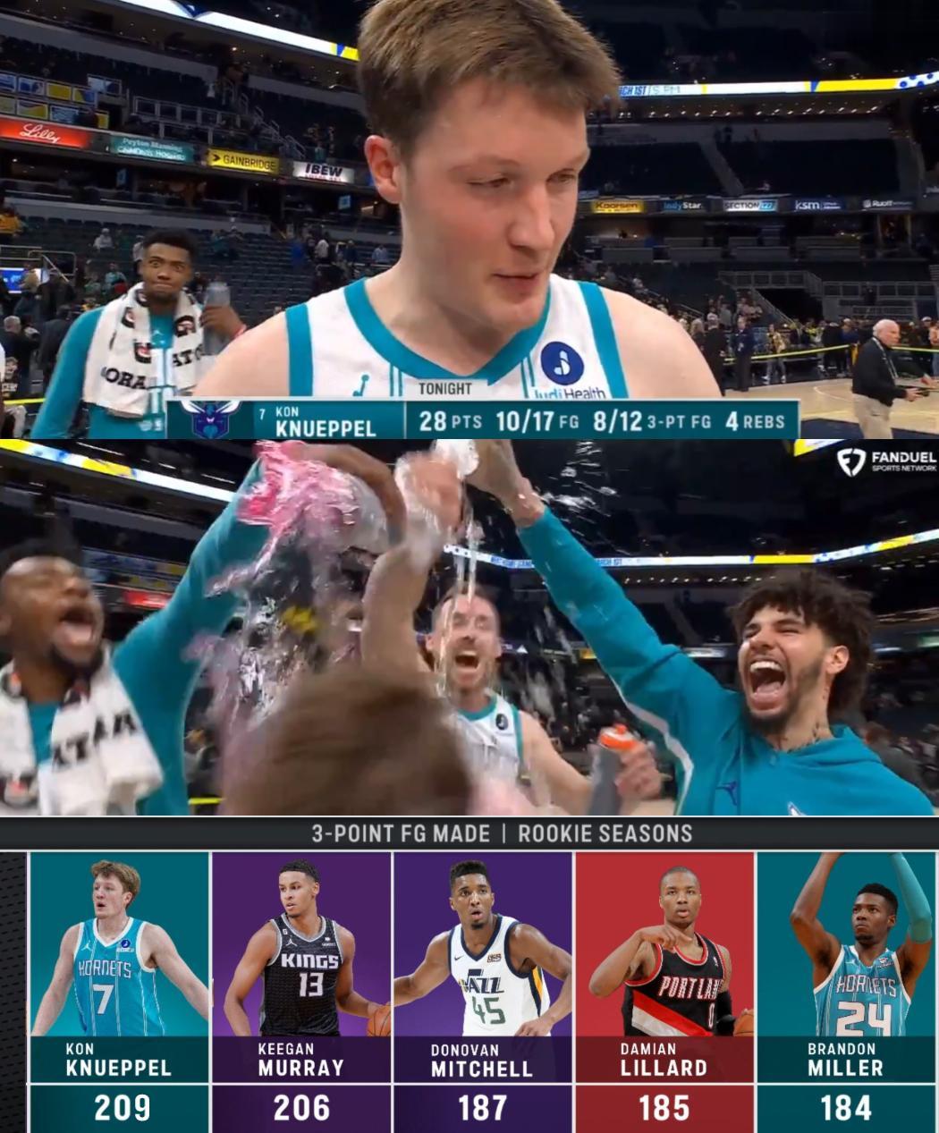 赛后,美国篮球媒体Ballislife更新社媒:“恭喜康-克尼普尔!他本月场均三分球命中数达到4.7个,如果他能在剩下的22场比赛中保持这个场均命中数,那么他作为新秀的三分球命中数将达到312个!300个三分球俱乐部成员:斯蒂芬-库里(6次)、詹姆斯-哈登、安东尼-爱德华兹、克莱-汤普森和马利克-比斯利。400个三分球俱乐部成员:斯蒂芬-库里。”