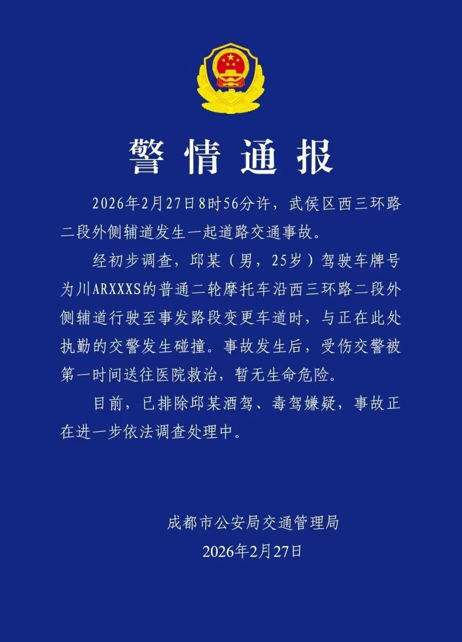 经初步调查,邱某(男,25岁)驾驶车牌号为川AR×××S的普通二轮摩托车沿西三环路二段外侧辅道行驶至事发路段变更车道时,与正在此处执勤的交警发生碰撞。事故发生后,受伤交警被第一时间送往医院救治,暂无生命危险。