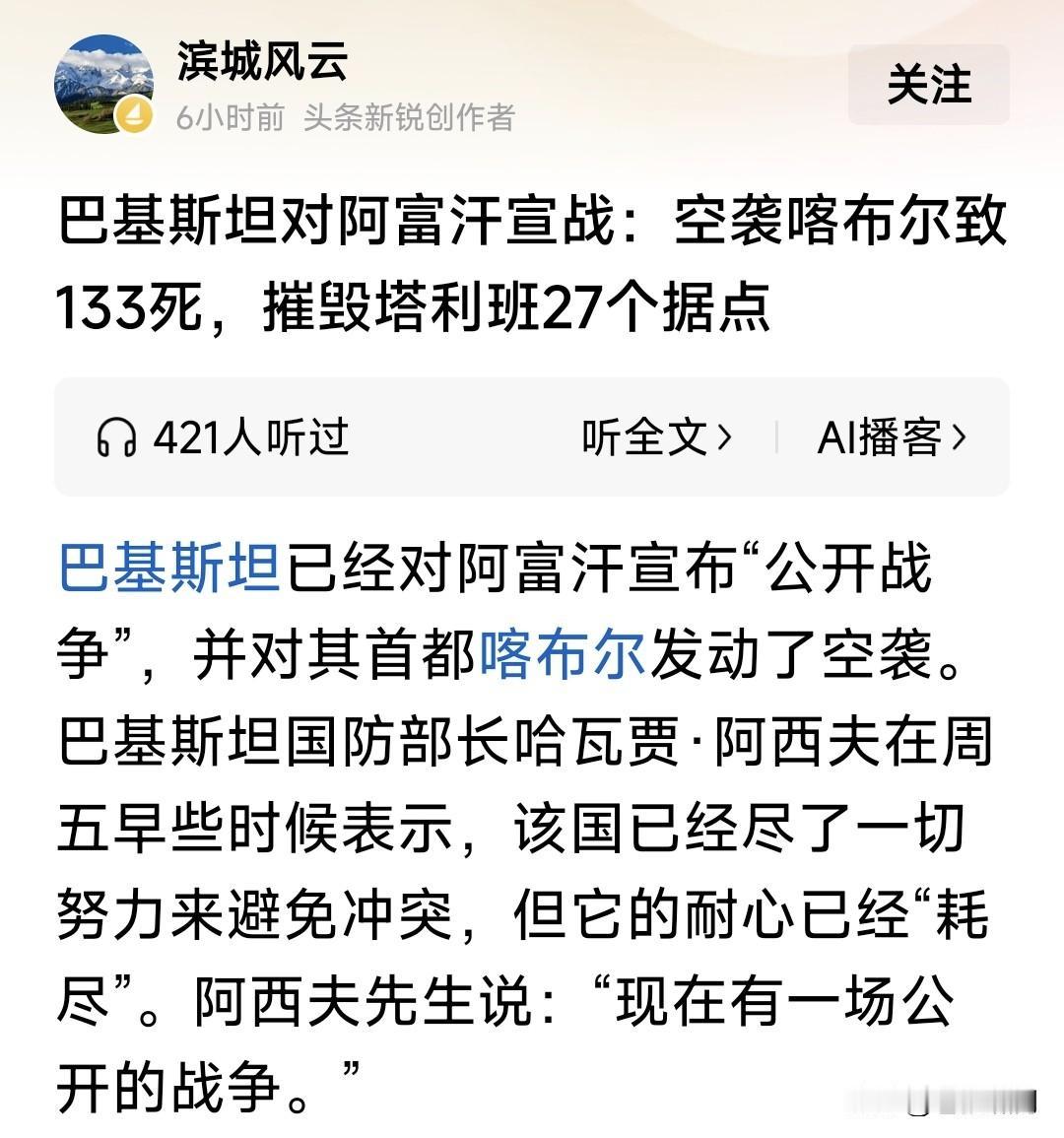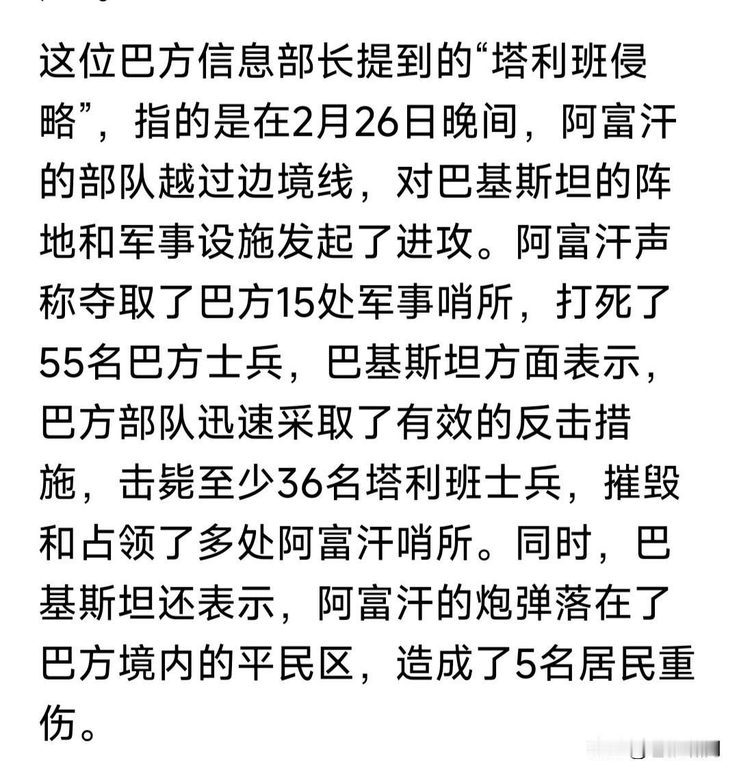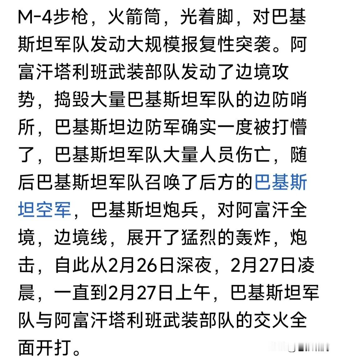 美伊冲突在即,巴阿率先开火!起因是阿塔26日出动千余士兵,突然对巴基斯坦边境哨所,发动地面和炮火袭击,导致巴方数十士兵与平民死伤! 巴方随即进行了反击,并对阿塔宣战!利用炮火优势,对其阵地与设施猛烈打击。并出动战机,轰炸首都喀布尔与多个城市,造成对方超百人伤亡! 巴阿何以发生冲突?两国为何如此仇恨?原因是苏美入侵阿富汗,大量难民涌入巴铁,现在巴要遣返难民,阿塔却不想接收,因此边境摩擦不断。 除此之外,还有一原因:阿富汗有反巴武装,被阿塔庇护支持!巴境内也有“反阿塔”组织,得到巴方支持。 以上两个原因,使双方仇怨积累摩擦不断。此前已多次发生边境冲突,这次规模最大!是否要彻底解决问题? 苍狼实在不明白,为何中东地区冲突不断?六次中东战争,两伊战争,伊科冲突与海湾战争,哈梅神权支持“哈真胡”作乱。根源是什么?如何解决? 也许另一场冲突:美伊冲突落幕,能解决问题?还能促使俄乌战争停战和平?当然只是猜想,是否如此还要靠实践检验!战争残酷,为何非要如此? …………