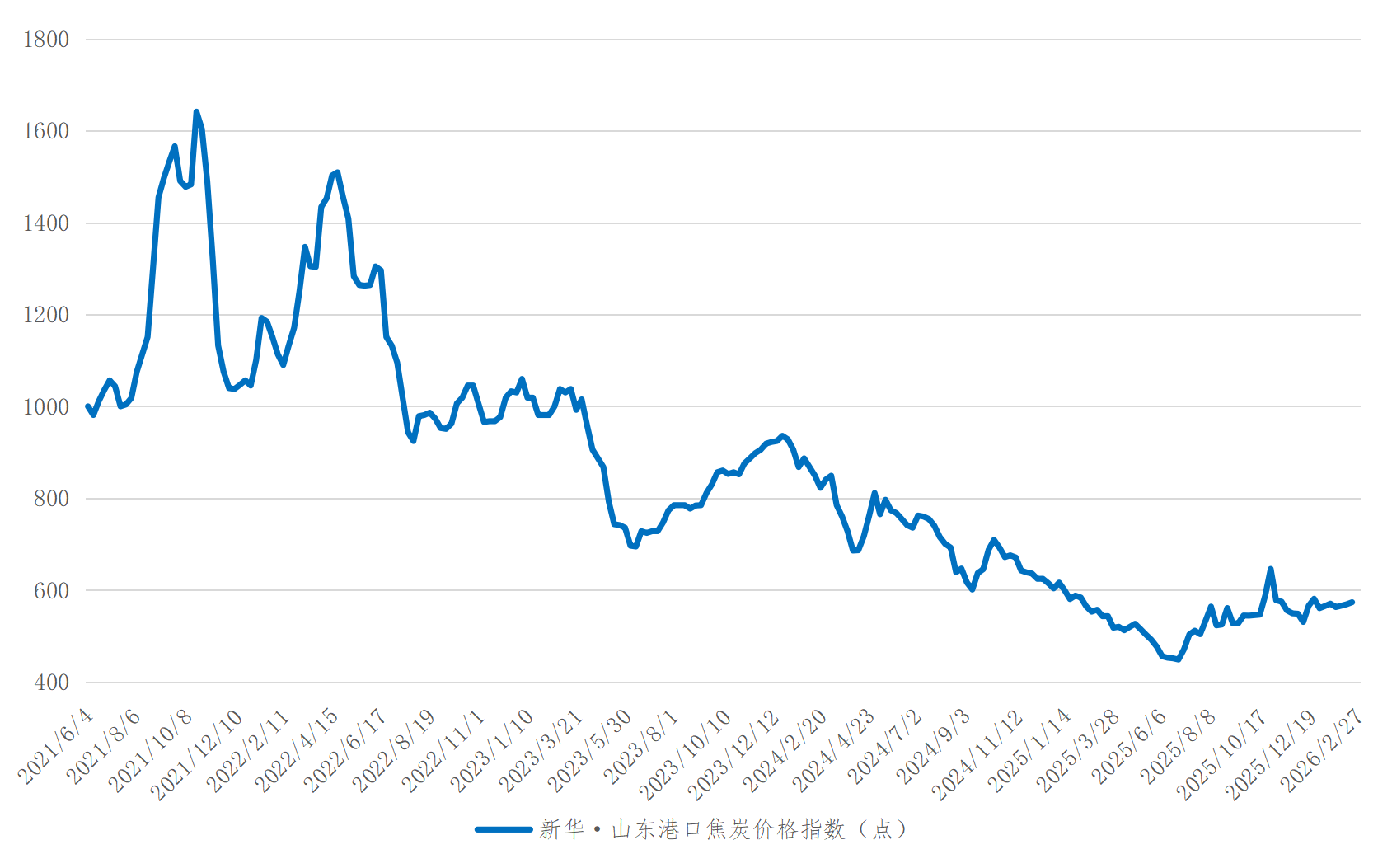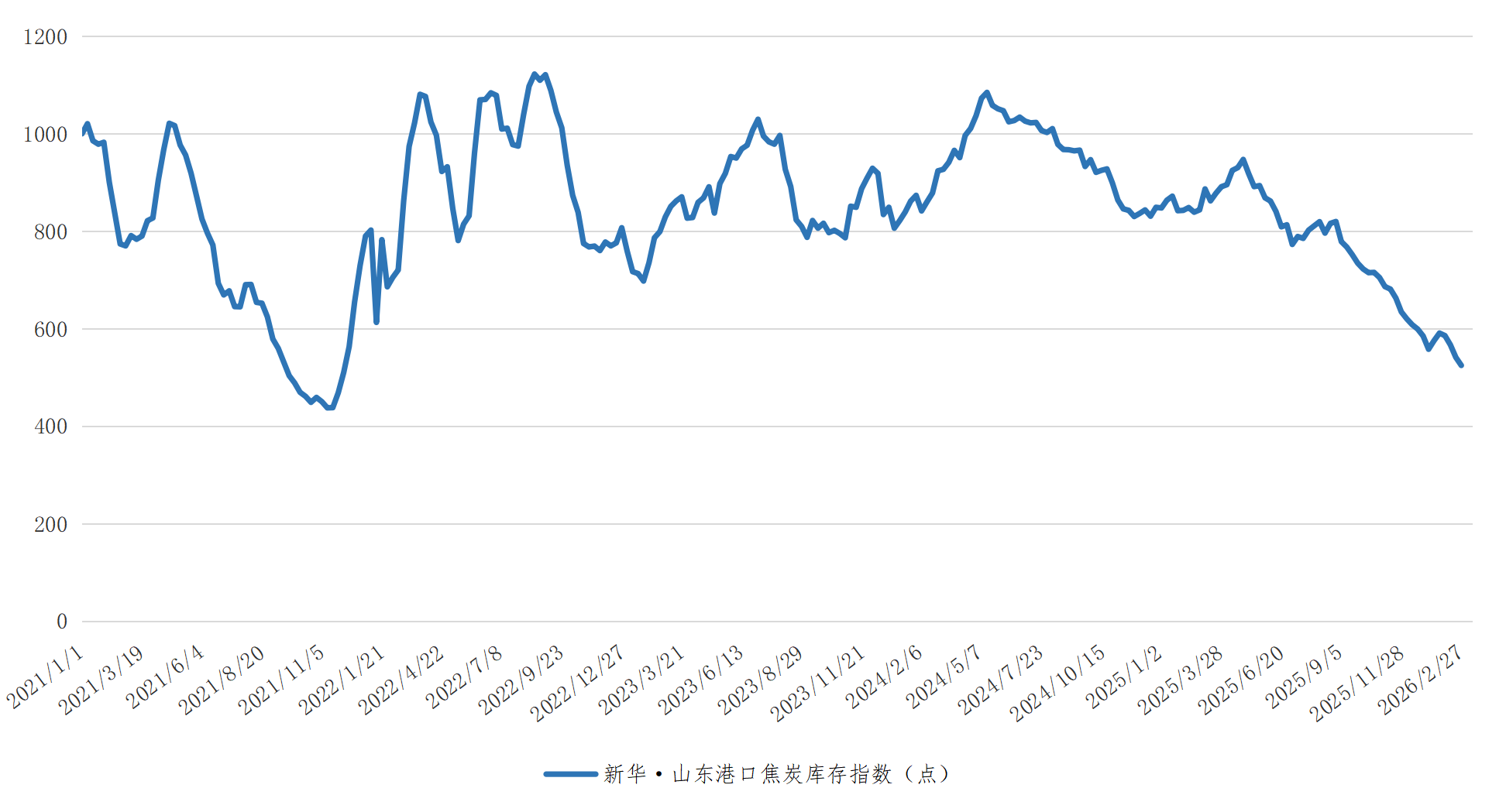 截至2月27日,新华·山东港口焦炭库存指数报524.79点,较2月13日下跌16.49点,跌幅3.05%。