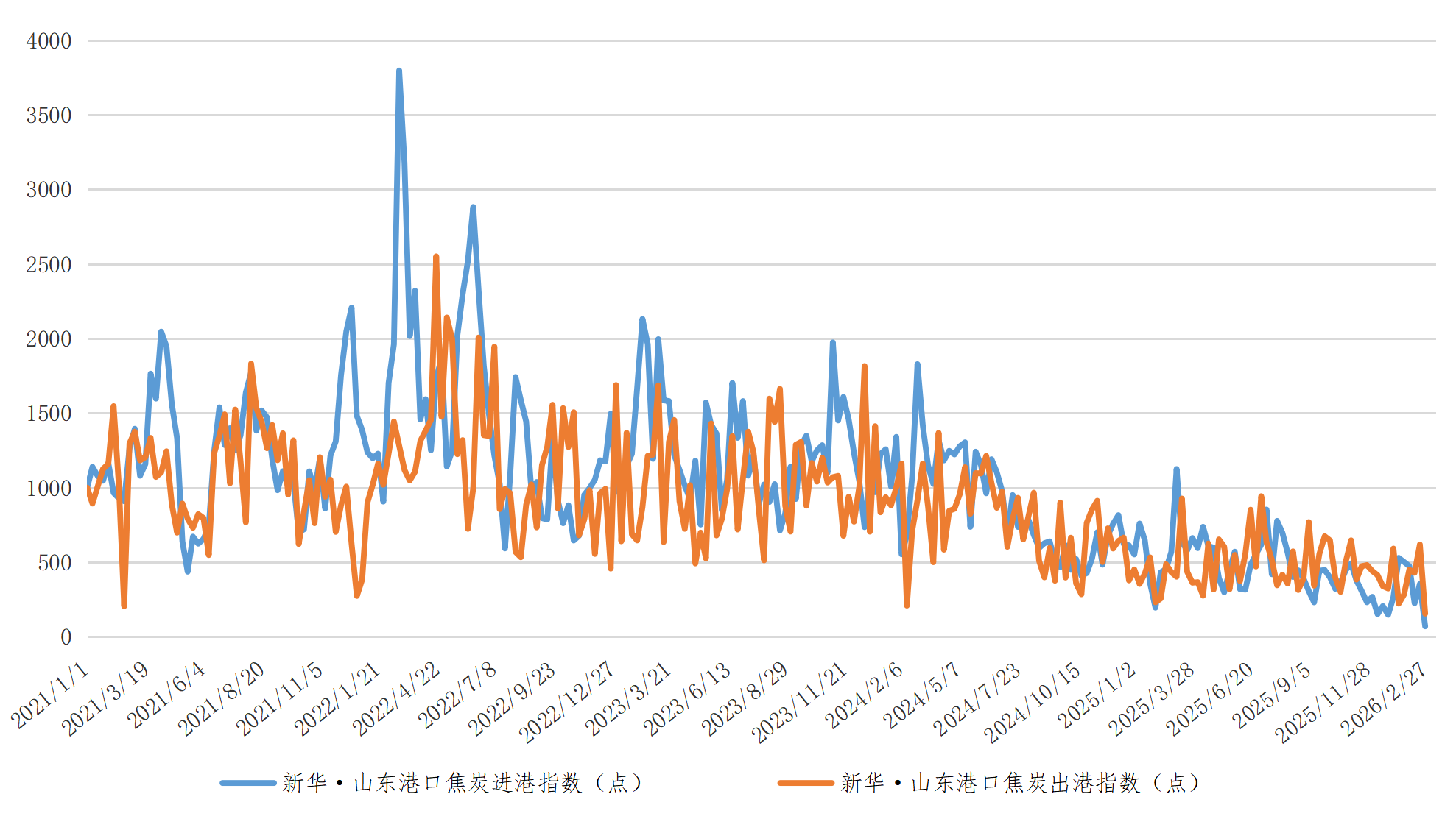截至2月27日,新华·山东港口焦炭进港指数报70.02点,较2月13日下跌284.10点,跌幅80.23%;新华·山东港口焦炭出港指数报155.22点,较2月13日下跌463.59点,跌幅74.92%。