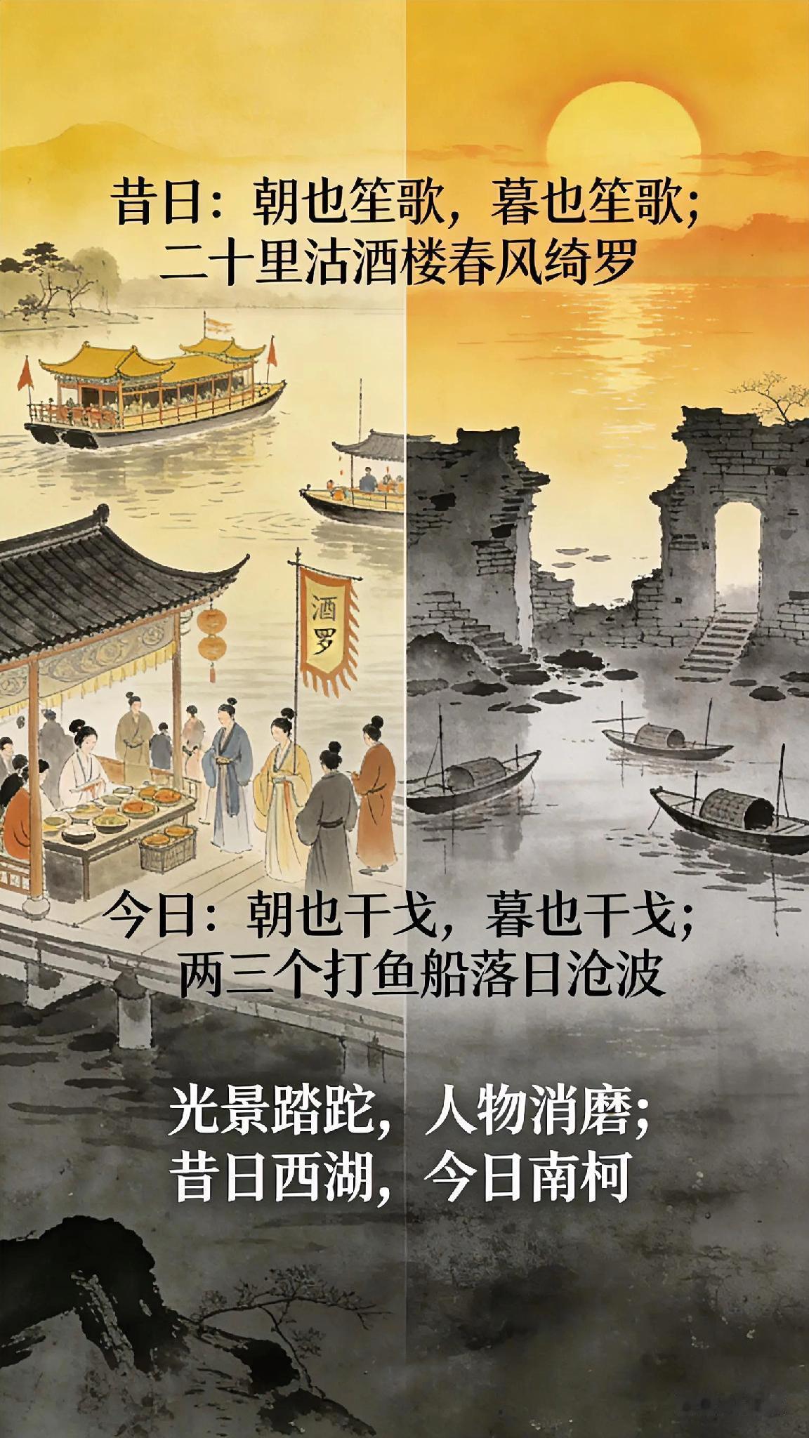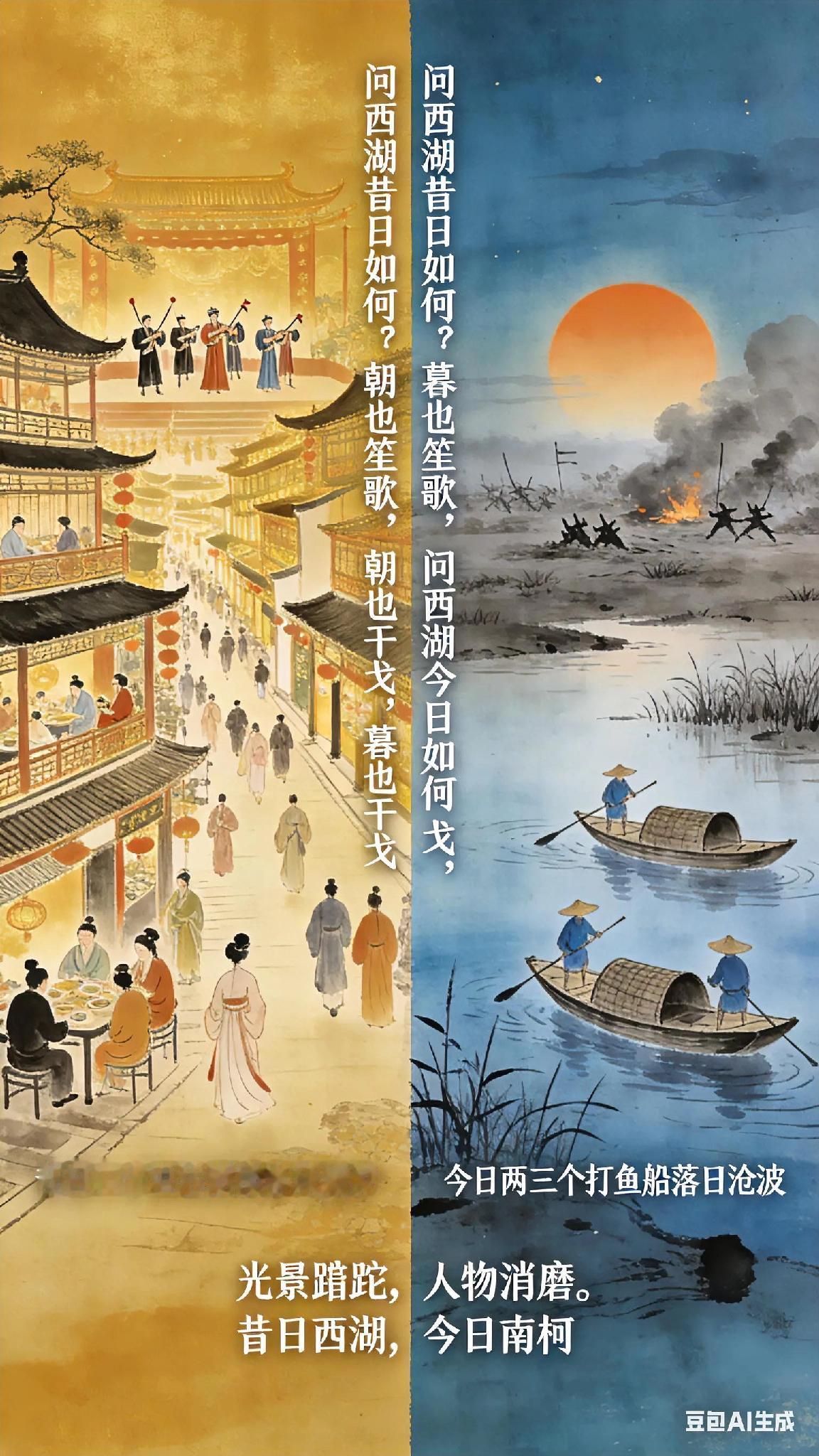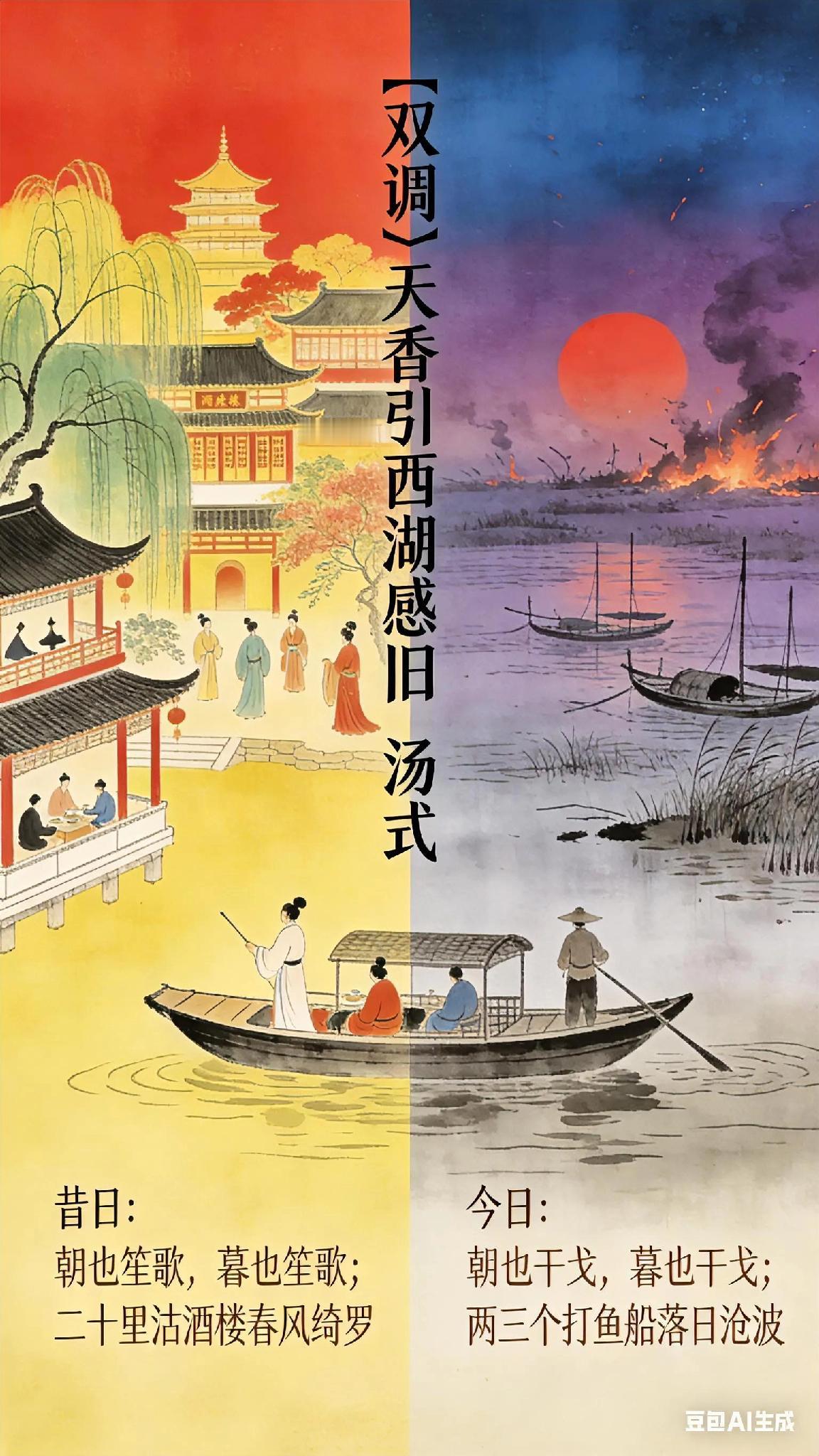 《双调》天香引西湖感旧、汤式。 问西湖昔日如何? 朝也笙歌, 暮也笙歌。 问西湖今日如何? 朝也干戈, 暮也干戈。 昔日也二十里沽酒楼春风绮罗, 今日个两三个打鱼船落日沧波。 光景蹉跎, 人物消磨。 昔日西湖, 今日南柯。 现译: 昔日的西湖何等繁华? 从早到晚,笙歌不断。 如今的西湖又是怎样? 从早到晚,战火纷飞。 过去,二十里长堤酒楼林立, 春风里尽是锦绣罗衣, 而今,只剩两三渔舟, 在落日余晖中漂荡。 时光流逝, 人事全非。 曾经的西湖盛景, 如今已成一场幻梦。 古诗词 你记得最深的一首古诗词是什么 你最喜欢的一句古诗词是什么 诗词歌赋