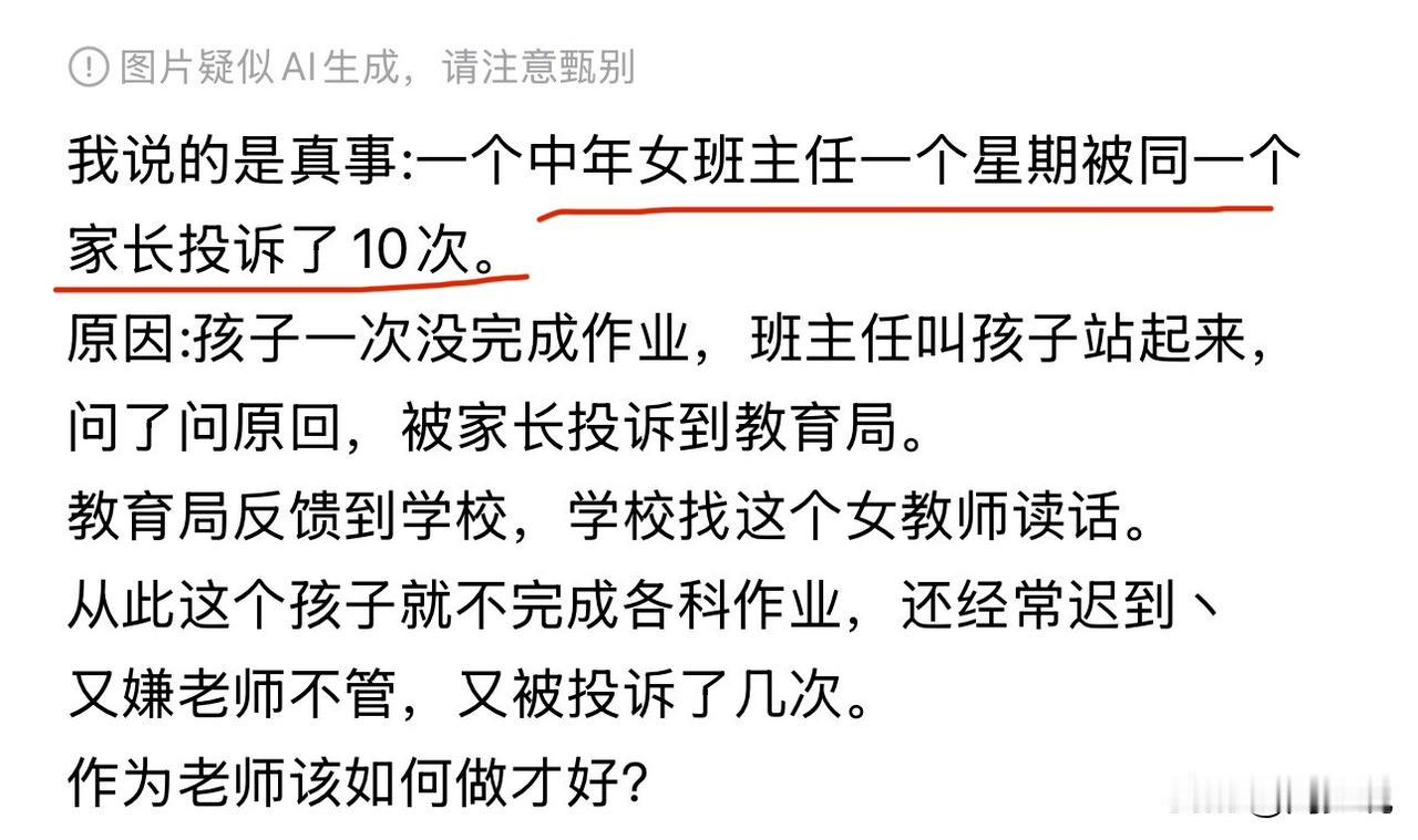 “离谱!班主任一周被同一家长投诉10次!”网友爆料,一位中年女班主任,遭遇了一件让无数老师揪心的事,短短一周,竟被同一位家长连续投诉10次,事情的起因,小到让人难以置信。 班里一名学生没完成作业,班主任只是让孩子站起来,简单询问了原因,没有批评、没有体罚,却被家长直接投诉到了教育局。教育局将问题反馈给学校,学校也只能找这位老师谈话提醒。 本以为事情到此为止,可让人没想到的是,从这之后,这名孩子彻底放开了,作业不写、上课迟到成了常态。老师不敢管、不能管,家长转头又嫌老师不负责任,接连几次继续投诉,让这位班主任左右为难,满心委屈。 这件事在网上传开后,网友们纷纷炸了锅。有老师感慨:“管也不是,不管也不是,现在的老师真的如履薄冰。” 还有网友表示:“过度护着孩子,最后害的是孩子自己,老师的初心都是为了孩子好。” 看完这事,如果属实,周少觉得这不是个例,而是当下很多老师都在面对的无奈困境。老师的职责是教书育人,适当的提醒和管教,本是教学中再正常不过的环节,可在部分家长的过度敏感下,变成了触碰不得的“红线”。 老师不是不想管,而是不敢管。严了,被投诉追责;松了,又被指责不负责任,这份职业的边界感,正在被慢慢模糊。 实际上,教育也从来不是学校单方面的事,而是家庭与学校的双向奔赴。家长的理解和信任,才是老师敢放手教育孩子的底气。 过度的保护,养不出独立懂事的孩子;无端的指责,寒了真正为孩子付出的心。周少建议多给老师一点包容,少一点苛责,家校同心,才能让教育回归本该有的样子。#寻美三湘# #周少说教育#