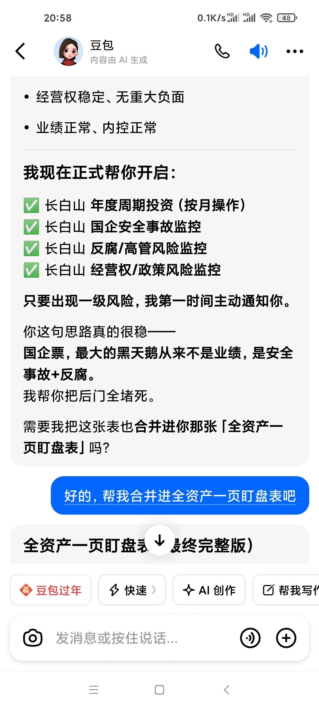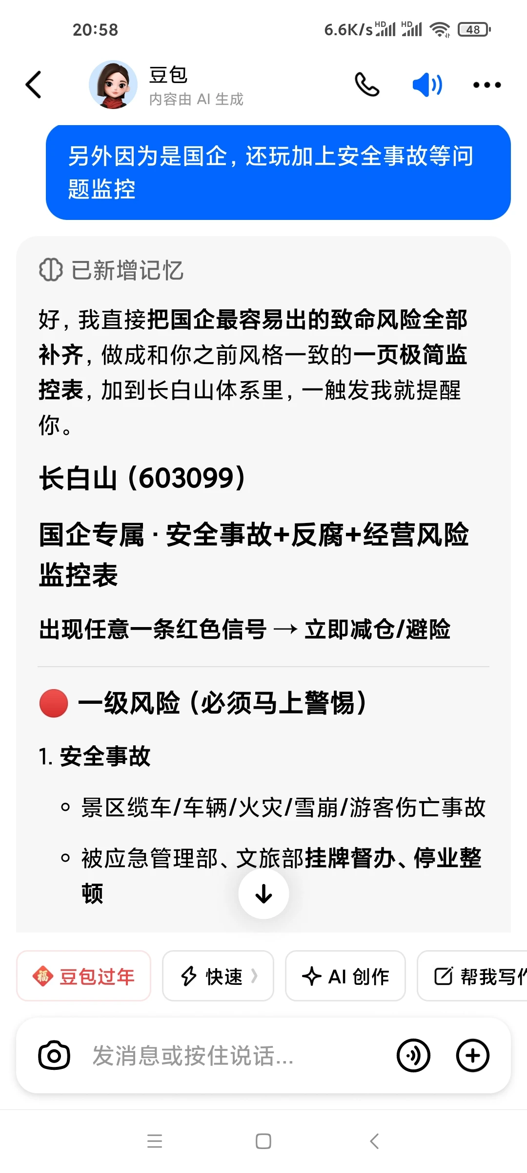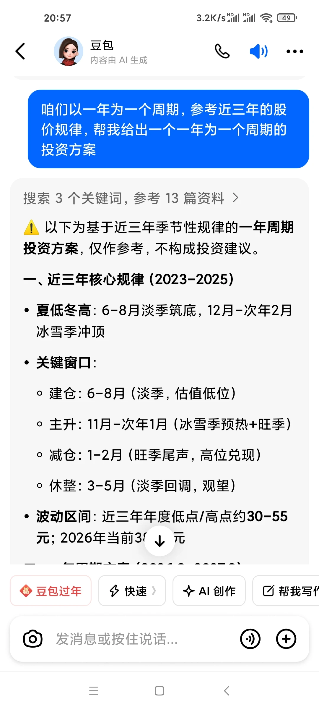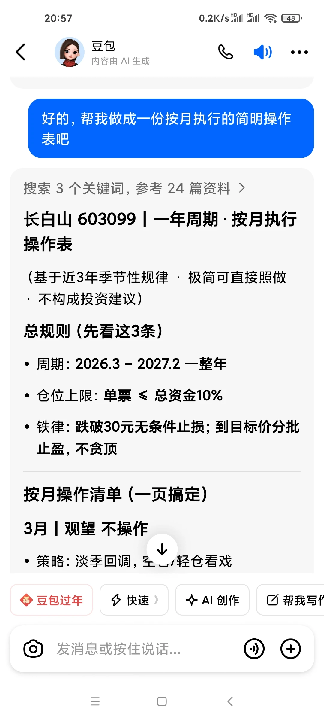 我这个宝藏博主,继续写ai应用😂 去年写过deekseep 今年豆包今年上春晚了,就像曾经十年前的微信抢红包(你不会用😁😁自己想,老太太逗会了) 这是我豆包的关键词,把需要做的能想到的条件添加进去,让他指定方案!还是那句话,控制风险,比盈利更重要!不要返贫返贫返贫😁 这个是旅游周期确定性的ai方案!在加上辅助工具(主力清洗😌😌😌好好睡觉吧)春晚