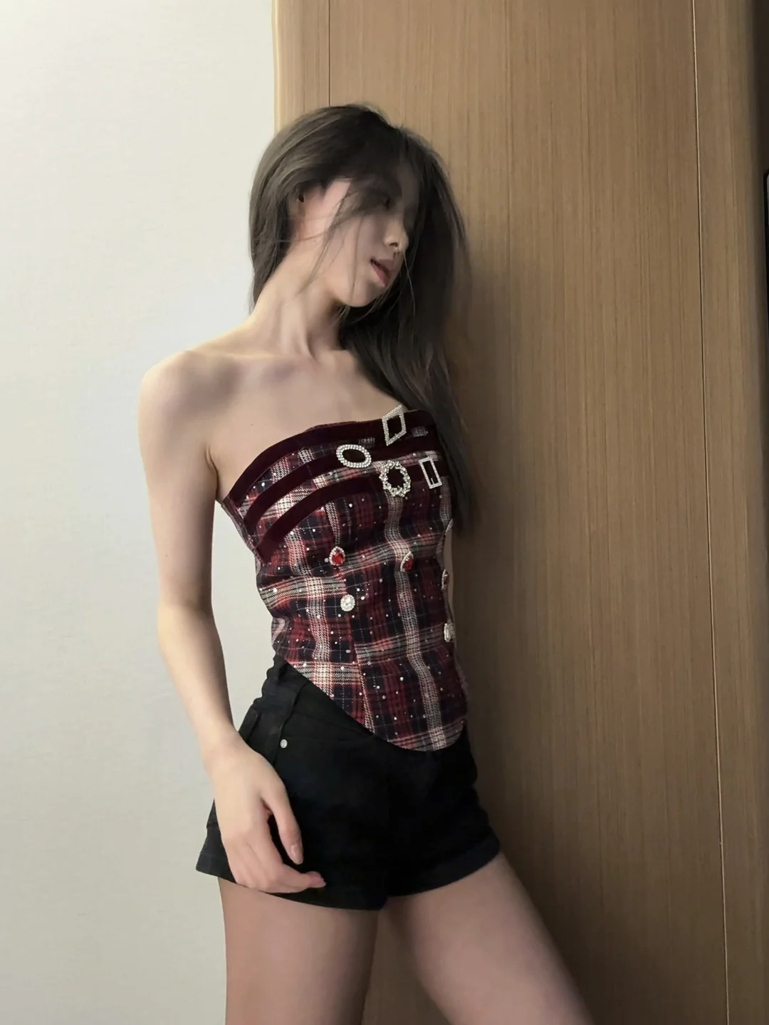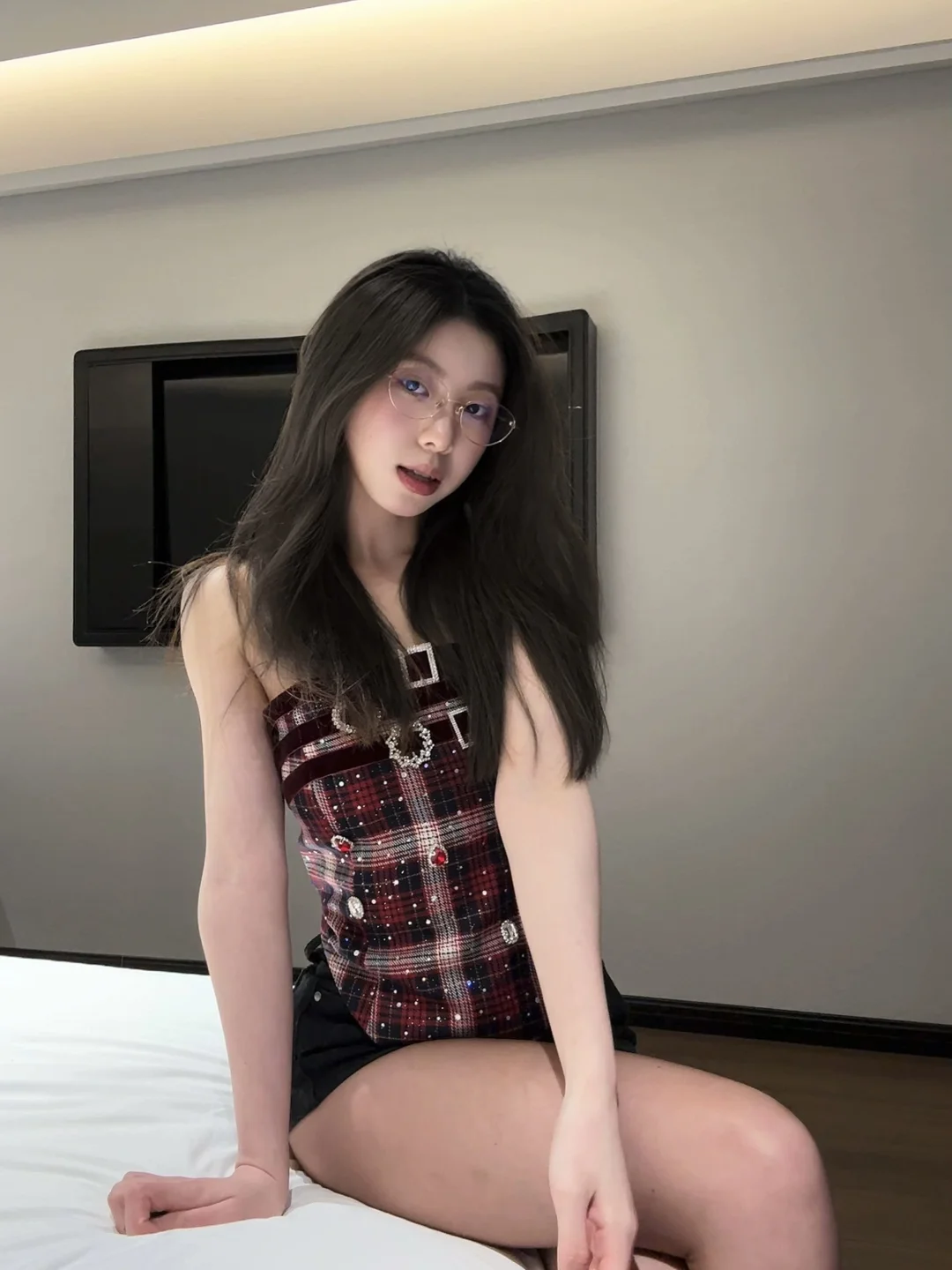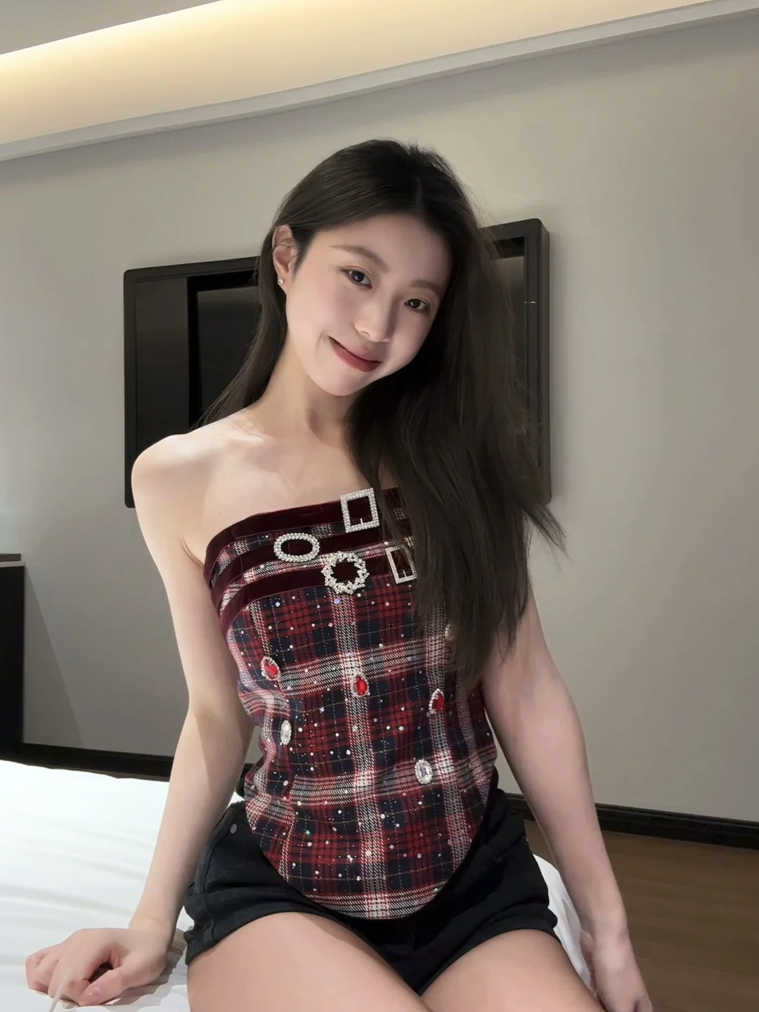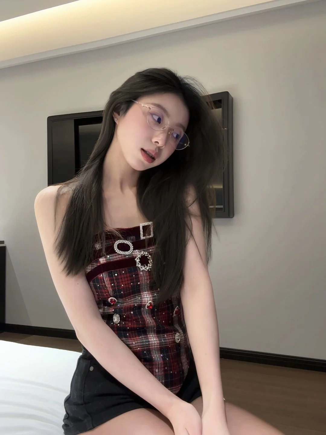 甜酷格纹抹胸+黑短裤,日常出街也能很吸睛✨ 这件抹胸的钻饰细节真的很加分,搭配黑短裤又A又飒,小个子也能轻松驾驭~