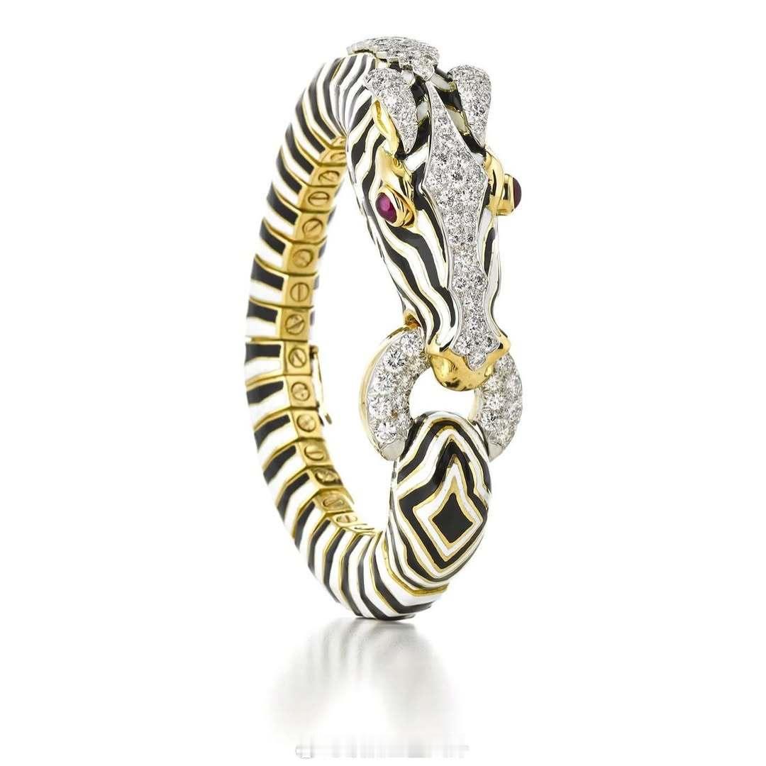 珠宝 曾属于西班牙罗曼诺斯伯爵夫人+社交名媛艾琳的斑马手镯,是David Webb60年代推出的经典款,材质主要有珐琅、18k金、碎钻和红宝,大概率为艾琳自行购入。她还挺喜欢的,能找到不少摆拍、跑趴时的佩戴照。艾琳晚年自行处理了一批珠宝(含图上的祖母绿套装),这手镯留给了当艺术家的孙女lulu