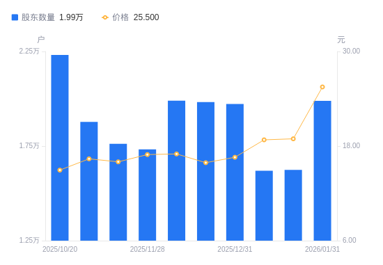 日期A股户数(户)流通A股户均持股数(股)户均持股市值(万元)2025-12-311972032160.2453.322025-12-201982531989.9150.832025-12-101989831872.5554.182025-11-281732436608.1761.942025-11-201762135991.1557.592025-11-101877633777.1655.332025-10-202231728417.8042.482025-09-301814034961.4163.702025-06-301641638633.0461.472025-03-312081530468.4140.71
