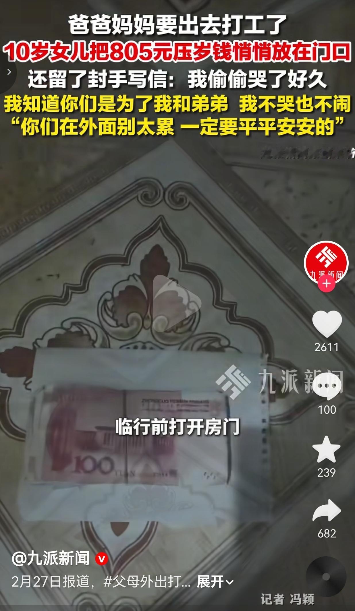 看哭了!2月23号,河南商丘的天还没亮,天气还有点寒冷,徐先生和妻子已经收拾好行李,就准备踏上去苏州的打工路。 夫妻俩轻手轻脚推开房门,生怕吵醒还在熟睡的一双儿女,却在门槛上瞥见了两样东西——一沓用红绳仔细扎好的零钱,下面紧紧压着一张写满字迹的信纸,纸张边缘还带着孩子反复摩挲的褶皱。 那是他们10岁的女儿悄悄放在这里的。钱是她攒了大半年的805元压岁钱,从百元大钞到五元小票,叠得整整齐齐。 信是她亲手写的,一笔一画歪歪扭扭,却透着超越年龄的懂事,每一个字都像敲在父母心上的小鼓。 信纸上,小姑娘的心里话看得人鼻子一酸:“亲爱的爸爸妈妈:明天你们就要出去打工了,我躲在房间里偷偷哭了好多次,我真的好舍不得你们走。 我知道我拦不住你们,也知道你们是为了我,为了我和弟弟,更是为了这个家,才出去打工辛苦赚钱的。 我不哭,我也不闹,也不会缠着你们走的。 因为我知道我一哭一闹,你们的心会难受的。 我把我身上的压岁钱都拿出来全部给你们,这是我能给你们做的一件小事了。你们在外面别太累,一定要平平安安的。” 信纸的角落,还补着几行小字,是她对父母的叮嘱:“你们在外面一定要吃好喝好,别总舍不得花钱,别太累,别生病。 徐先生拿着那沓钱,看着信上的字,瞬间红了眼眶。妻子蹲在门口,手捂着嘴,眼泪还是忍不住砸在地板上。徐先生后来在接受采访时说,看到那封信和钱,心疼又心酸,连看第二遍的勇气都没有。 这805块钱,对他们在苏州的房租、生活费来说,不过是杯水车薪,甚至不够夫妻俩半个月的伙食费。 但对这个10岁的小姑娘来说,这是她全部的“家当”,是她藏了好久、舍不得买零食和玩具的积蓄,更是她能想到的,给远方父母最好的“护身符”。 她或许不懂生活的重担有多重,只知道把自己最珍贵的东西给爸妈,就能让他们少受点苦。 很多人看了可能会说,现在的孩子娇生惯养,吃不了苦,不懂事。 可他们不知道,在无数个留守儿童的家里,这些孩子早就被迫长大了。 就像徐先生的女儿,父母不在家时,她要听奶奶的话,认真读书写作业,不调皮不惹人生气。还要照顾年幼的弟弟,给他穿衣服、哄他开心,做家里的“小大人”。 他们学会了自己梳头发、自己热饭,学会了在夜里打雷时抱紧弟弟,躲在被窝里默念“爸妈在外面平平安安”。他们把思念藏在心底,把眼泪擦在枕头里,把“懂事”挂在脸上,只是为了让远方的父母能少一点牵挂,能安心赚钱。 这种被逼出来的“懂事”,比哭闹更让人心疼。 徐先生说,他们背井离乡去苏州打工,没日没夜地干活,就是为了多赚点钱,给孩子更好的生活,让女儿和弟弟能读更好的学校,穿更漂亮的衣服,不用像他们一样吃苦。 可什么是“更好的生活”? 是城里宽敞明亮的大房子,还是孩子成长路上每一次家长会的缺席?是银行里不断上涨的存款数字,还是孩子第一次换牙、第一次考满分时,想要分享却找不到父母的失落?是给孩子买成堆的玩具和零食,还是错过了她从懵懂孩童长成懂事少女的每一个瞬间? 我们总以为,赚够了钱,就能弥补所有的亏欠。可孩子的童年,就像春天的花,花期只有一次,错过了就再也开不回来了。那些父母缺席的日子,那些孩子独自扛过的委屈,那些想要拥抱却只能对着手机屏幕的瞬间,再多的钱也买不回来。 这个10岁的小姑娘,用805元压岁钱和一封手写的信,狠狠戳中了无数人的软肋。她用自己最朴素的方式告诉我们:孩子要的从来不是多么优渥的物质生活,不是名牌鞋服和昂贵玩具,而是父母的陪伴,是放学回家时能喊一声“爸妈”,是受委屈时能扑进父母怀里,是那句实实在在的“我在”。 最终,徐先生和妻子还是带着女儿的牵挂出发了,只是他们把那805元钱又悄悄留了下来,夹在了女儿的课本里。他们说,这钱是孩子的心意,要留给她,这也是他们在外打拼的动力。而那封信,夫妻俩小心翼翼地折好,放进了行李箱的最里层,走到哪里,都带着女儿的牵挂。 可现实的拉扯,远比想象中更让人无力。 大巴车一路颠簸,徐先生看着身边的妻子,她从离家那一刻起就没止住眼泪,到了苏州后更是情绪崩溃,实在顶不住了。徐先生看着妻子红肿的眼睛,又想起女儿信里那句“我会每天都想你们”,心像被揪着一样疼。 最终,他做了一个艰难的决定:又把老婆送回了商丘老家,让她先陪着孩子到开学,等女儿和弟弟适应了新学期的生活,再考虑外出打工的事。 他说:“钱可以慢慢赚,但孩子的成长,等不起。” 针对此事,你有什么看法呢?欢迎大家评论区讨论留言。
