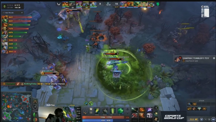 [8:52]下路混战,Malr1ne毒龙被X哥伐木机转盘飞脸与Corrupted沙王被击杀,同时上路X哥莲花池旁被杀,森哥迷路再送一个,双方打出2换2。