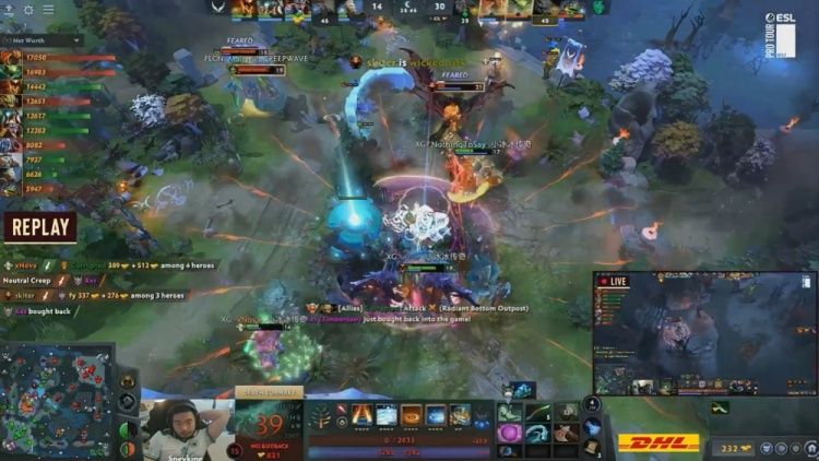 [40:05]XG开雾野区抓人,xNova先被skiter龙骑切掉,前者买活再打,森哥开滚,哥哥影魔击杀朗戈。随后哥哥影魔骑脸输出击杀skiter,Malr1ne毒龙完美输出位力保猎鹰打出2换4,猎鹰拿到三代肉山,不朽之守护给到Malr1ne毒龙。