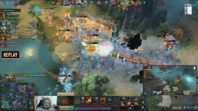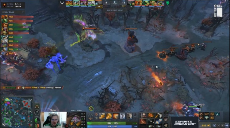[34:05]野区团战,森哥海象神拳打飞skiter,NTS牛头开bkb进场控住skiter,skiter没开出bkb被X哥联手队友秒掉,XG打出0换2。