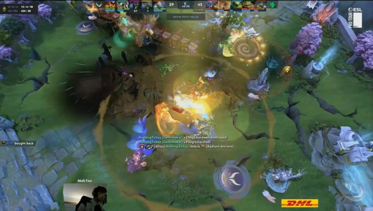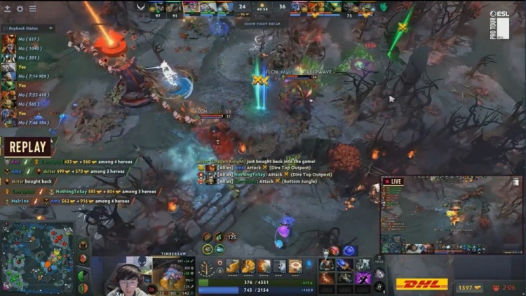 [19:58]中路混战,哥哥被skiter龙骑逮捕击杀,NTS原地空大,Malr1ne毒龙瞬间三杀,猎鹰打出0换4。