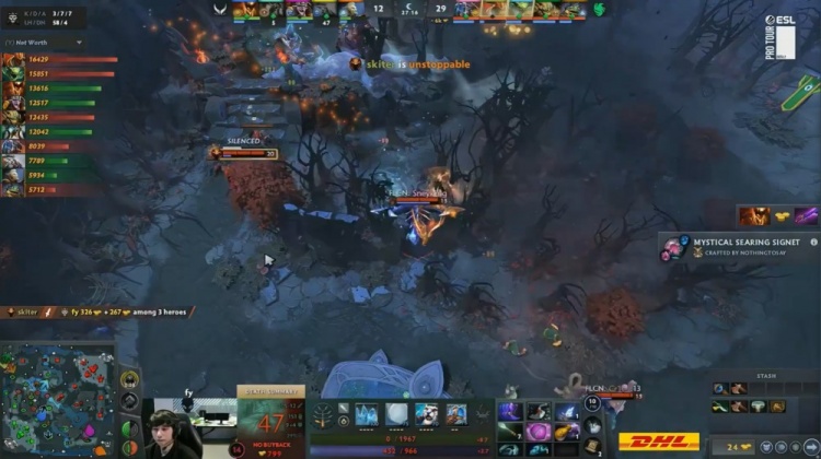 [28:39]野区团战,skiter龙骑没顶住被哥哥影魔融化,XG打出1换3后打掉二代肉山,不朽之守护给到哥哥影魔。双方经济差距来到1k之内