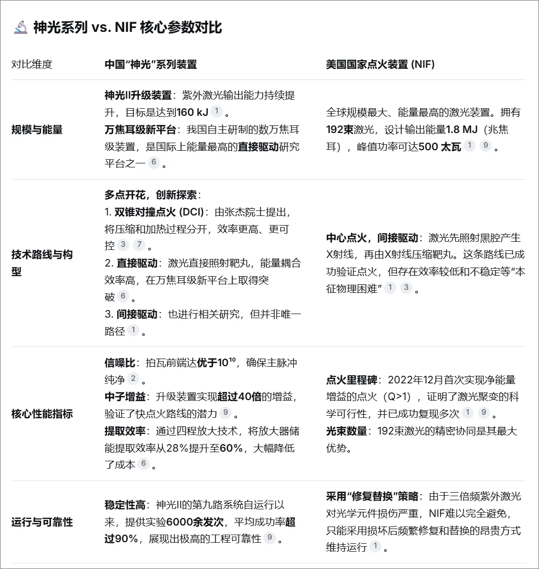 而中国的神光系列与美国国家点火装置(NIF)相比,可以说是一场世界顶尖激光聚变设施之间的同台竞技。NIF证明了激光聚变的科学可行性,而中国的神光系列则通过独特的中国方案和一系列关键技术突破,在效率、精度和特定指标上实现了赶超,走出一条差异化的发展道路。