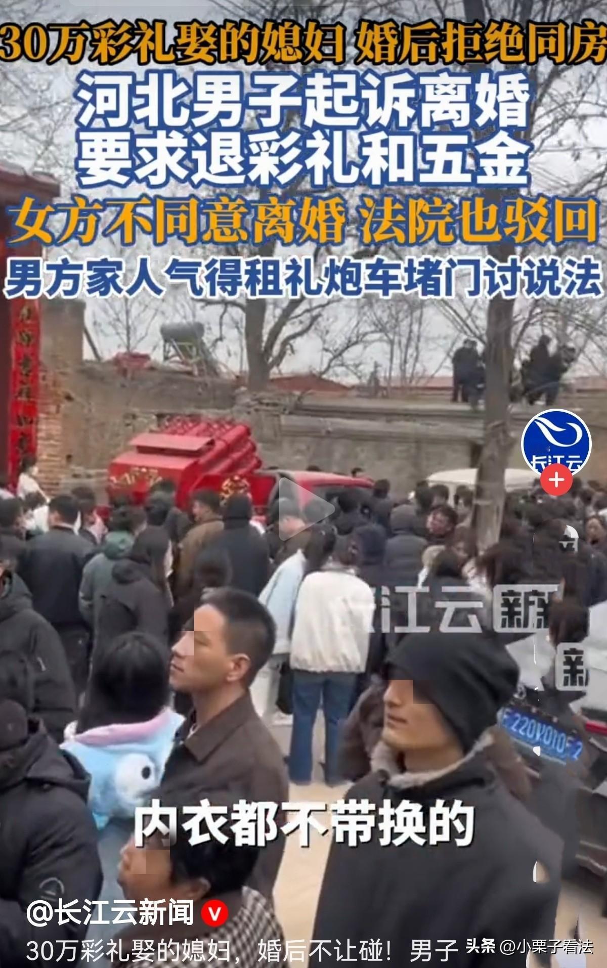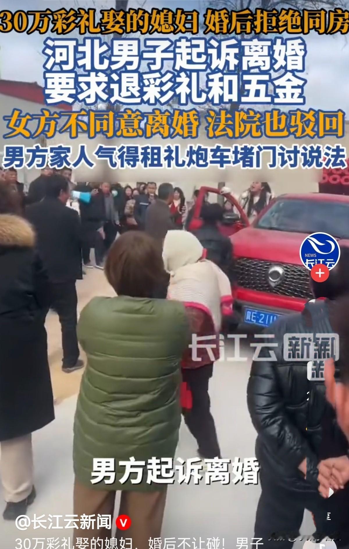 “这脸丢大了!”河北邢台,男子与女子经媒人介绍相亲,女子比他小5岁,是隔壁村的,两人彼此看好,便订了下来,彩礼加租金及物品共30多万。3个月后两人就结婚了。谁知,两人结婚2年,男子称妻子拒与其同房,不履行妻子义务。男子一怒起诉离婚,要求退还30万彩礼,哪料,妻子坚决不离婚,而法院判决让男方家崩溃,接下来他们的做法不可思议! 男方是1994年的,没正式工作,父母在城里买了房、添了车,看着同龄人都成家生子,家里急着给他张罗婚事。 两年前,经媒人介绍同乡隔壁村的女方,比他小5岁,两人一见面对彼此都没意见,便将订婚提上日程。 女方要20多万彩礼,再加上五金首饰、新手机,前前后后花了30多万,男方都统统答应照办。 两人相处3个月后,2024年2月就领证闪婚。 本以为都照着女方的要求做,答对她们满意,小两口结婚后就能和和美美地过日子了。 可婚后的日子,完全不是两家预想的样子。男方说,女方结婚后一直拒绝同房,两人长期分房住,婚姻有名无实。 他觉得自己掏光家底娶媳妇,却过不上正常日子,越想越憋屈。 找媒人、找中间人调解,几次都谈不拢,一怒之下,2025年4月,男方把女方告上了法院,要求离婚,还要女方返还彩礼257800元、42800元的五金,以及9400元的手机,总共30多万。 而女方坚决不离婚,还说男方说的“拒同房、分房住”全是假话,两人一直共同生活,感情没破裂。 更让人意外的是,女方说自己被男方打骂拖拽,患上了抑郁症,还住院治疗过。 至于彩礼,女方称早就买了家电、电动车当陪嫁,再加上日常开销和看病吃药,钱早就花完了,根本不存在退彩礼的说法。 法庭上,双方各执一词,吵得不可开交。 《民事诉讼法》第67条规定:当事人对自己提出的主张,有责任提供证据。 法院审理后认为,男方想离婚必须拿出确凿证据证明夫妻感情确已破裂。 因男方拿不出证据,基于女方又不同意离婚,一审驳回了男方的离婚诉求。 这判决让男方一家彻底炸了锅,在他们看来,女方就是不想退钱,故意拖着不离婚,30多万的彩礼打了水漂,人财两空的委屈无处发泄。 大年初六,也就是2026年2月22日,男方家属终于忍不住了。 他们租了一礼炮车来到女方娘家村口,炮声一响,很快引来村民围观。 有人拿着喇叭反复喊结婚拒同房,睡觉都不脱衣服,内衣都不带换的!“骗婚”“还彩礼钱”! 还开着直播把事情发到网上,这场闹剧从22号持续到25号,25号当天更是从早上九点闹到傍晚六点,想靠舆论逼女方妥协。 女方家被围得水泄不通,跟看大戏一样,家人不敢出门,没法工作,整日躲在家里担惊受怕。 女方妹妹婷婷说,对方根本不是来解决问题的,就是来闹事污蔑。 姐姐被骂得吃不下饭、睡不好觉,半夜经常惊醒,一家人还遭到网暴,连亲戚都被牵连。 无奈之下,女方家把法院判决书贴在现场,想证明自己没骗婚,同时向政府部门求助,坚持要走法律程序,要求对方删除视频、停止直播、公开道歉澄清。 《民法典》第1032条:自然人享有隐私权。任何组织或者个人不得以刺探、侵扰、泄露、公开等方式侵害他人的隐私权。 隐私是自然人的私人生活安宁和不愿为他人知晓的私密空间、私密活动、私密信息 。 女方的代理律师也表示,男方的做法太偏激,用舆论施压解决家事,完全不可取。 如果女方觉得名誉权、住宅安宁被侵犯,也可以起诉维权。 而且彩礼的认定有讲究,酒席钱、改口费不算彩礼,还要扣除女方的陪嫁,按照法律规定,结婚满一年以上,彩礼一般不用退。 男方上门喊话的方式确实不妥,但因是婚姻纠纷引发,没造成严重后果,主要以调解为主。 这场持续四天的闹剧,最终惊动了当地政府。2月26日,现场终于恢复平静,没人再围观吵闹。 女方家属说,之前男方起诉离婚时坚决不同意,现在经历了这场羞辱,也彻底寒了心,愿意考虑离婚,目前当地政府已经介入调解。 到27号上午,男方堂姐社交账号上的相关视频已经下架,这场闹得满城风雨的彩礼纠纷,总算暂时告一段落。 有人说,正规结婚后,又收了30万彩礼,女方不做夫妻义务,应归还彩礼。 有人说,男的要是强制同 房,会不会被判强 奸坐牢三年? 还有人说,女方涉嫌婚姻欺诈罪,未履行夫妻之间相互扶持的义务。 对这样的闹剧,您觉得男女双方,谁更过分呢?