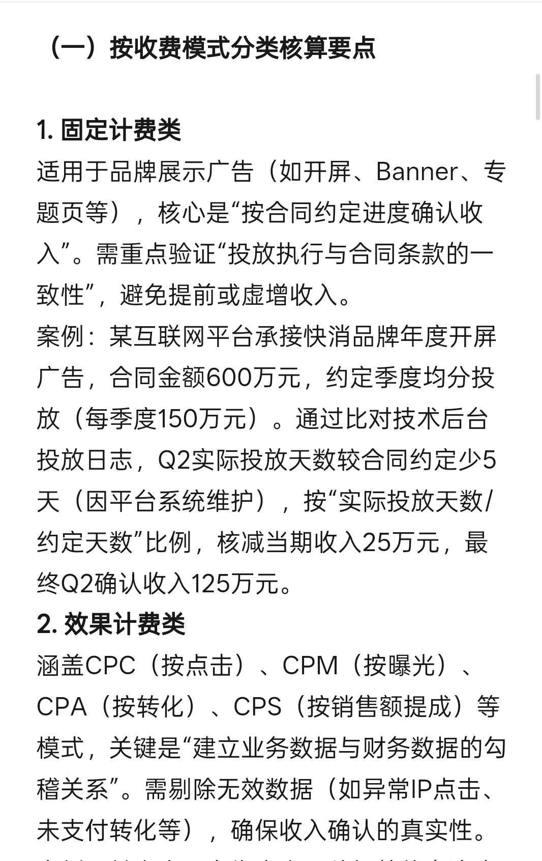 适用于品牌展示广告(如开屏、Banner、专题页等),核心是“按合同约定进度确认收入”。需重点验证“投放执行与合同条款的一致性”,避免提前或虚增收入。