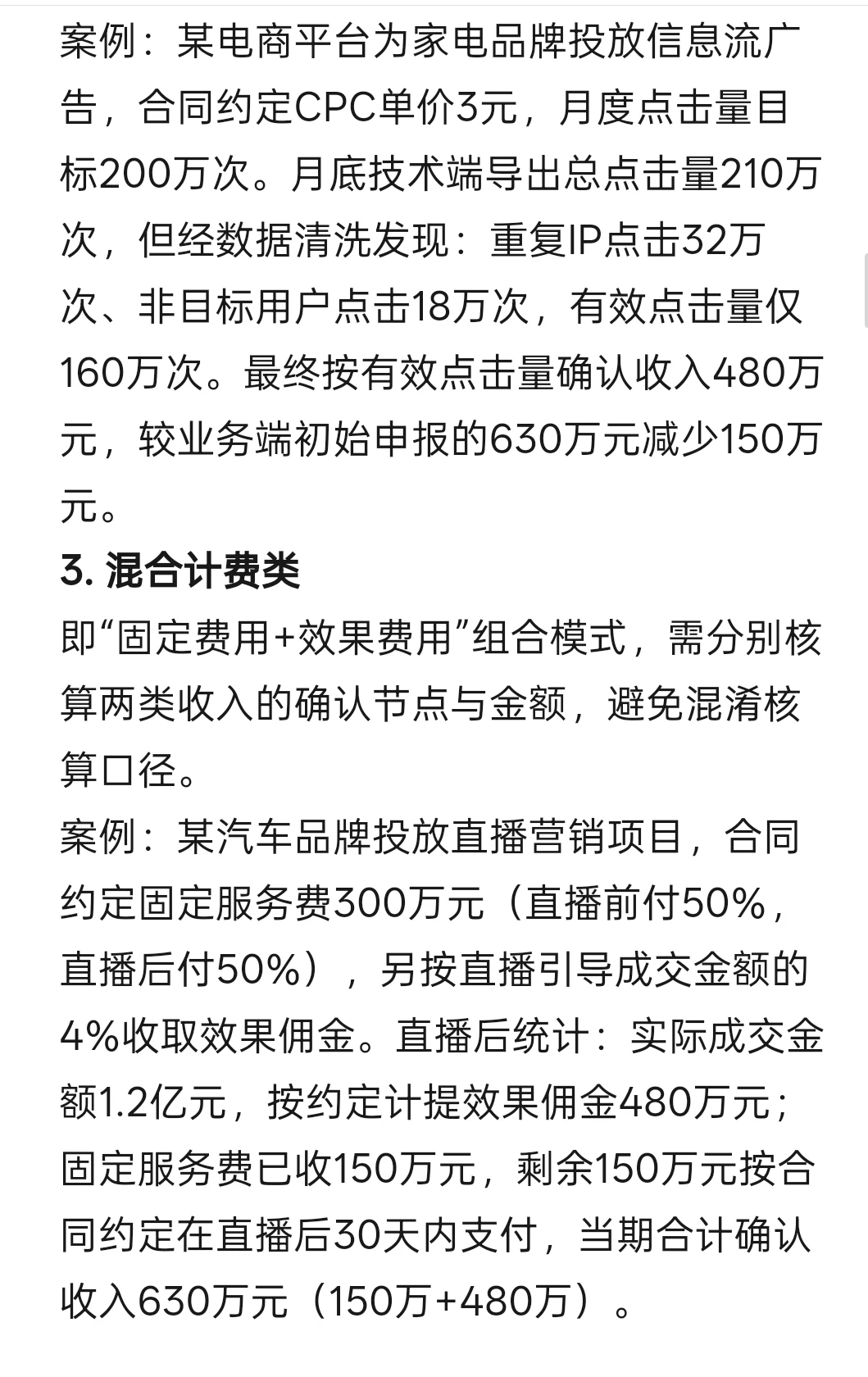 案例:某汽车品牌投放直播营销项目,合同约定固定服务费300万元(直播前付50%,直播后付50%),另按直播引导成交金额的4%收取效果佣金。直播后统计:实际成交金额1.2亿元,按约定计提效果佣金480万元;固定服务费已收150万元,剩余150万元按合同约定在直播后30天内支付,当期合计确认收入630万元(150万+480万)。