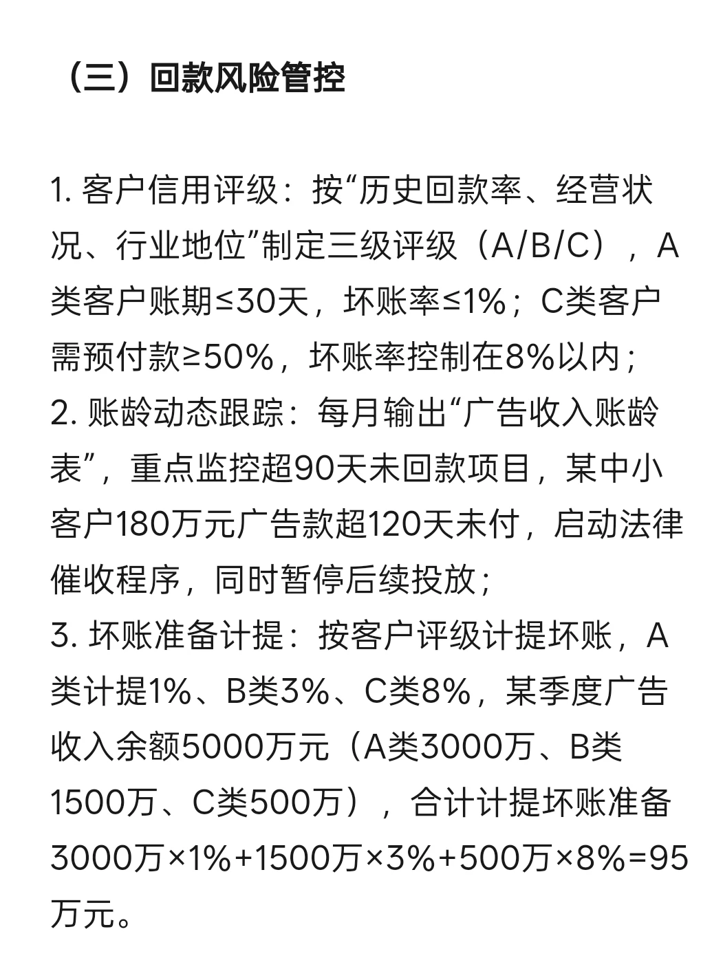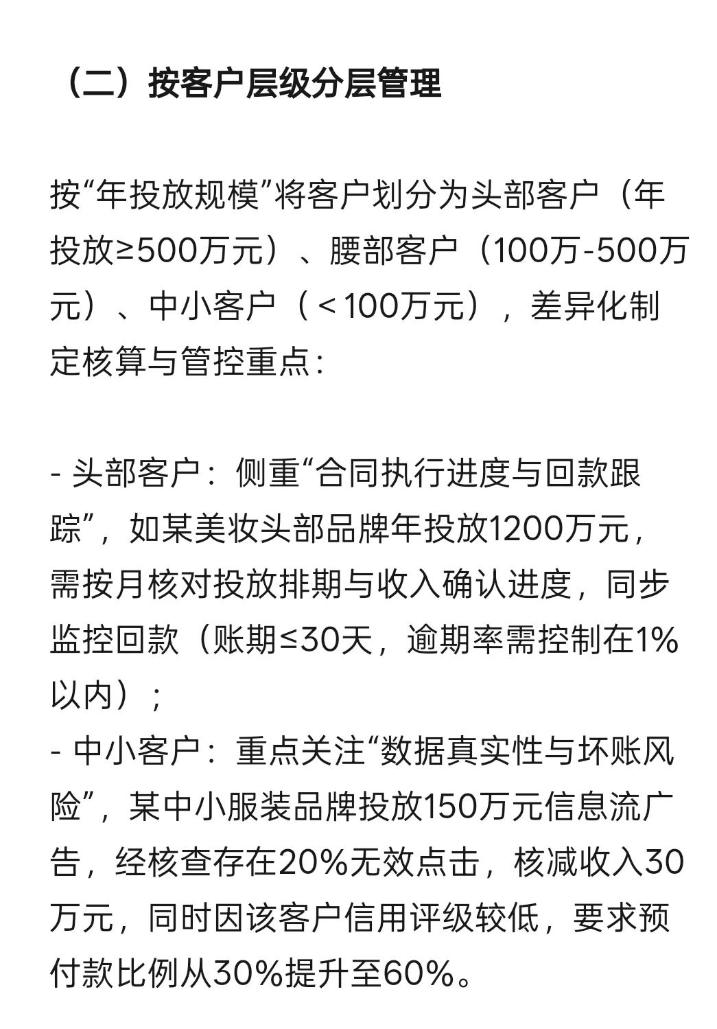 按“年投放规模”将客户划分为头部客户(年投放≥500万元)、腰部客户(100万-500万元)、中小客户(<100万元),差异化制定核算与管控重点: