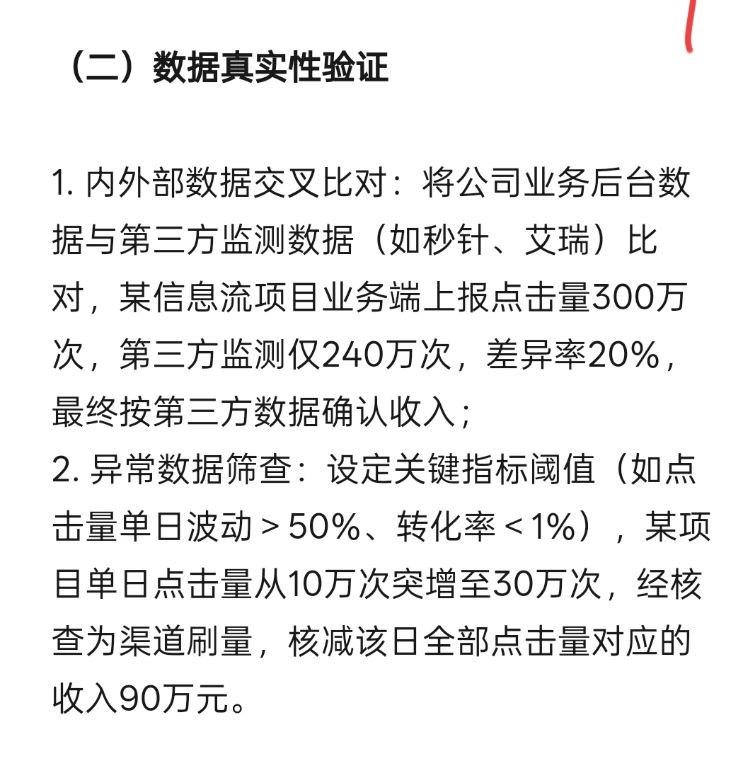 案例:某电商平台为家电品牌投放信息流广告,合同约定CPC单价3元,月度点击量目标200万次。月底技术端导出总点击量210万次,但经数据清洗发现:重复IP点击32万次、非目标用户点击18万次,有效点击量仅160万次。最终按有效点击量确认收入480万元,较业务端初始申报的630万元减少150万元。