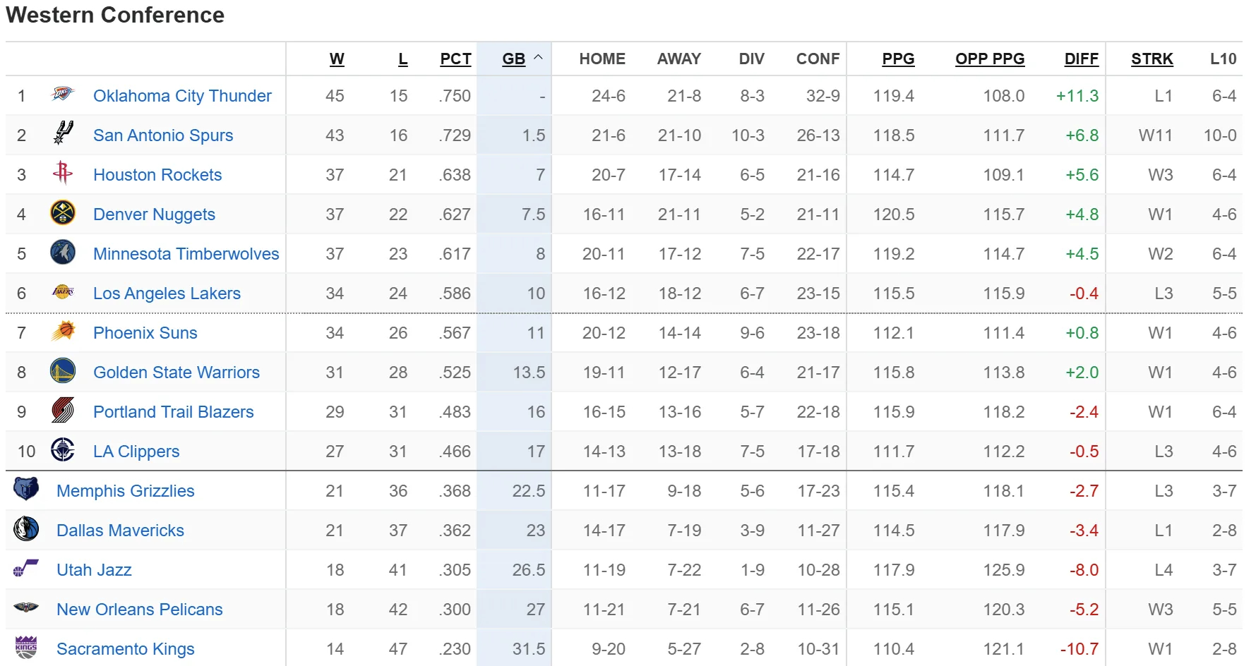 今日赛后排名与签位更新:76人击败热火,马刺11连胜,距离雷霆1.5个胜场,太阳绝杀湖人,鹈鹕客胜爵士,森林狼击败快船。