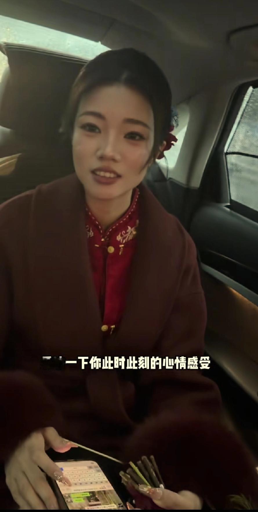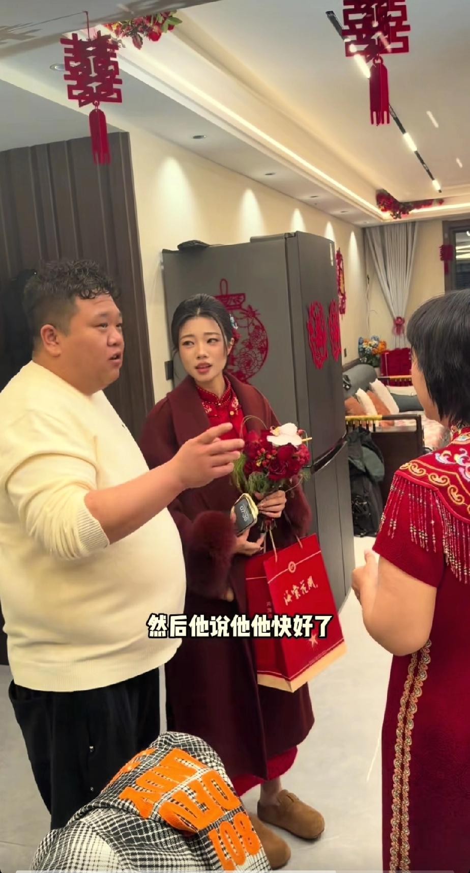 解清帅的大妹长得十分漂亮,回门时身着喜庆的红色旗袍,外面套着一件羊绒大衣,手捧鲜花,尽显富贵之相。两个哥哥去接妹妹回门,一路上说说笑笑、打打闹闹。解梁静刚离开老公没几分钟,就在车上和老公聊得热火朝天。回门当天还有摄像小哥跟拍,留作纪念,倒也不错。