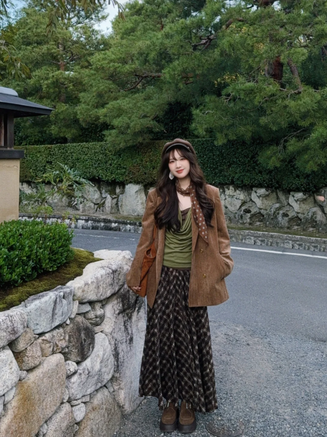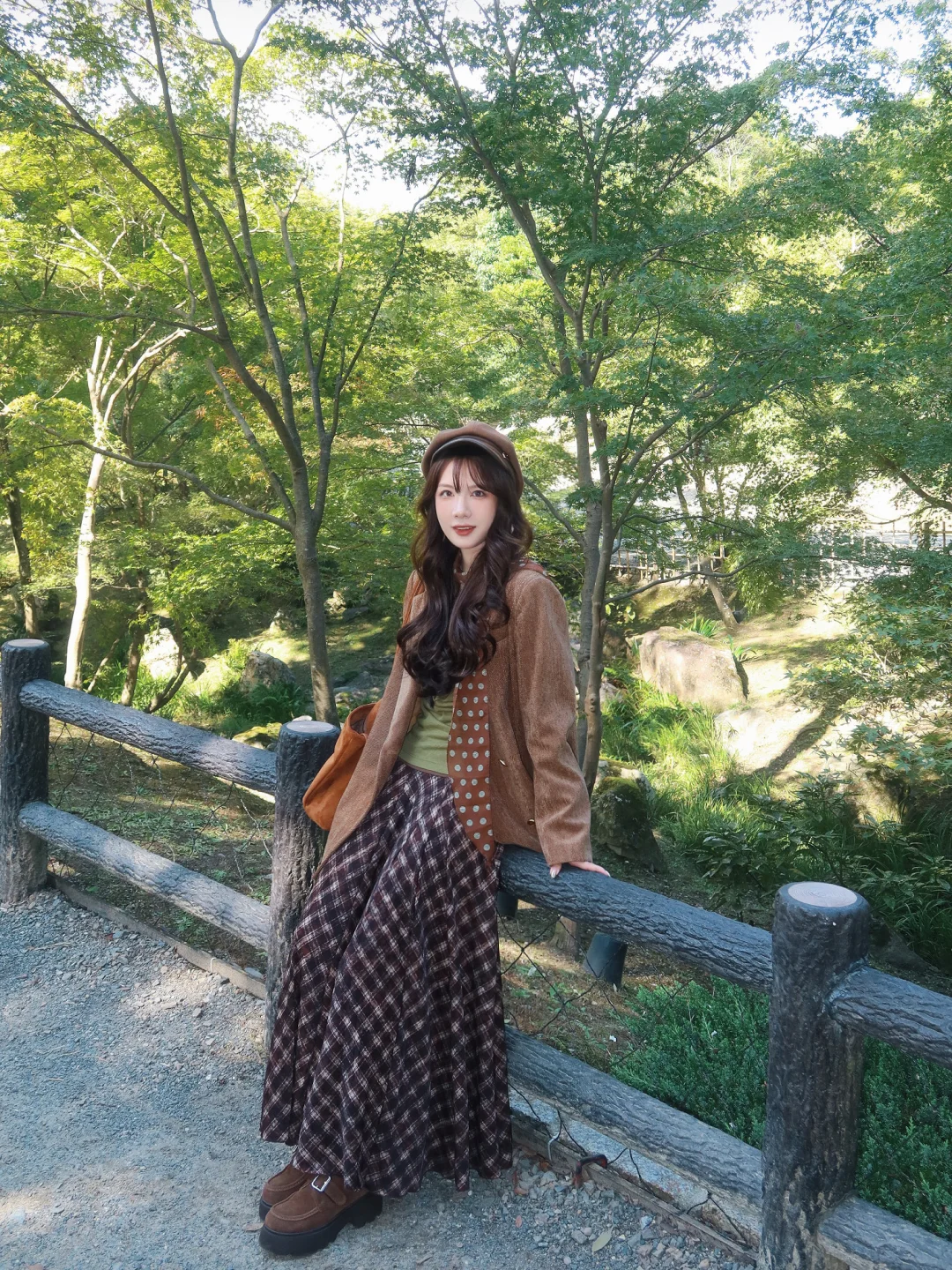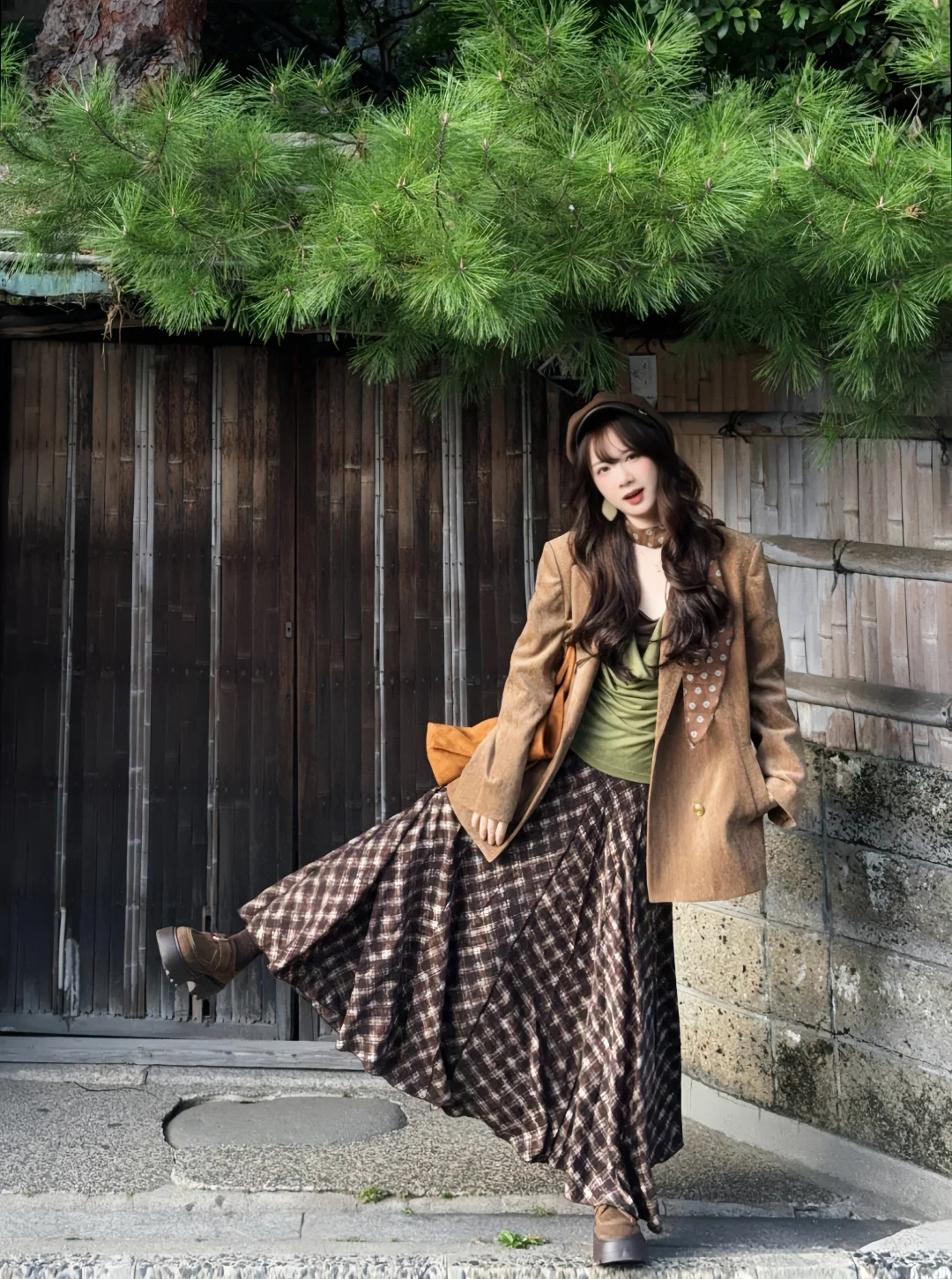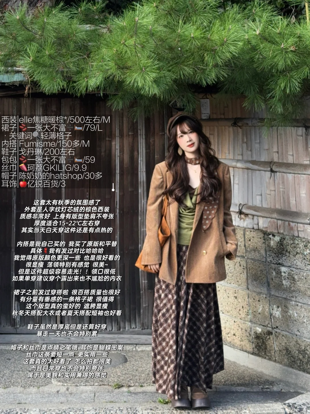 棕色外套➕绿色系内搭➕棕色格子裙 很复古~