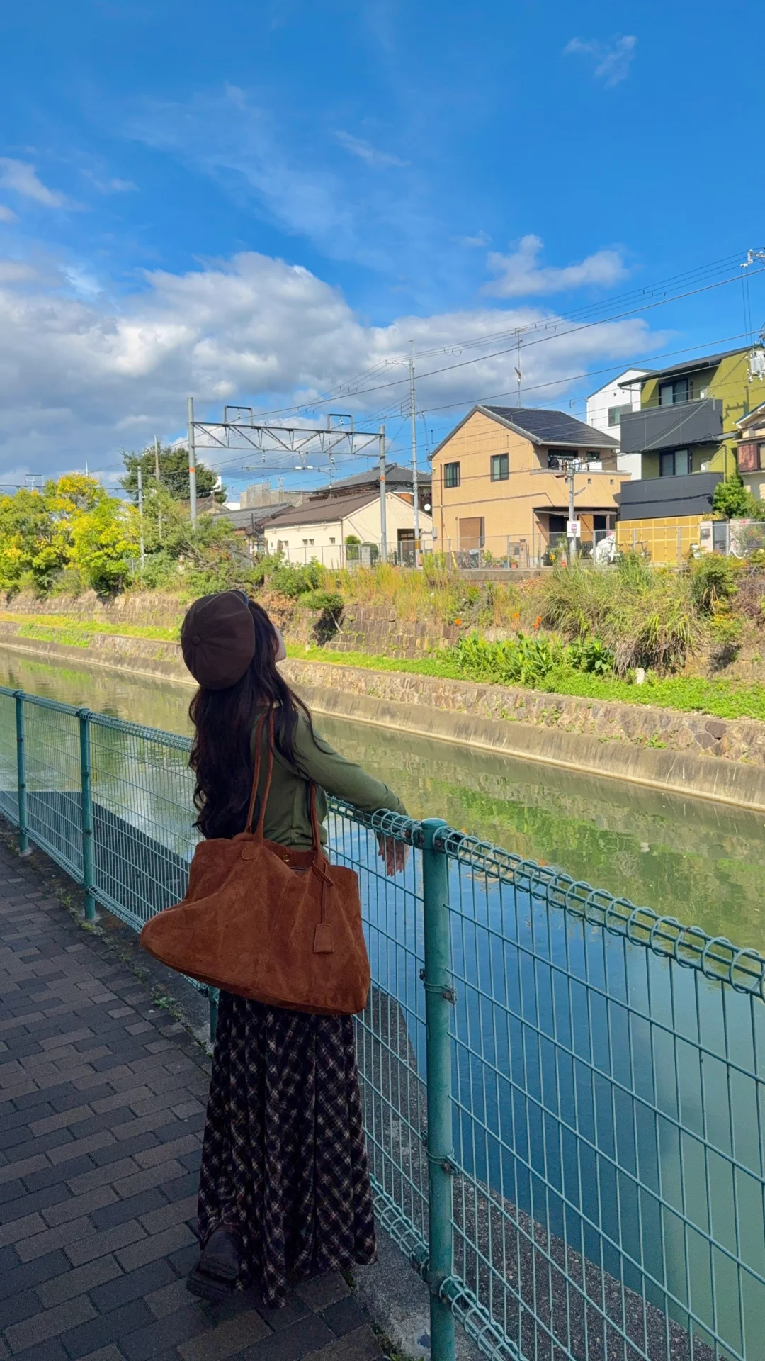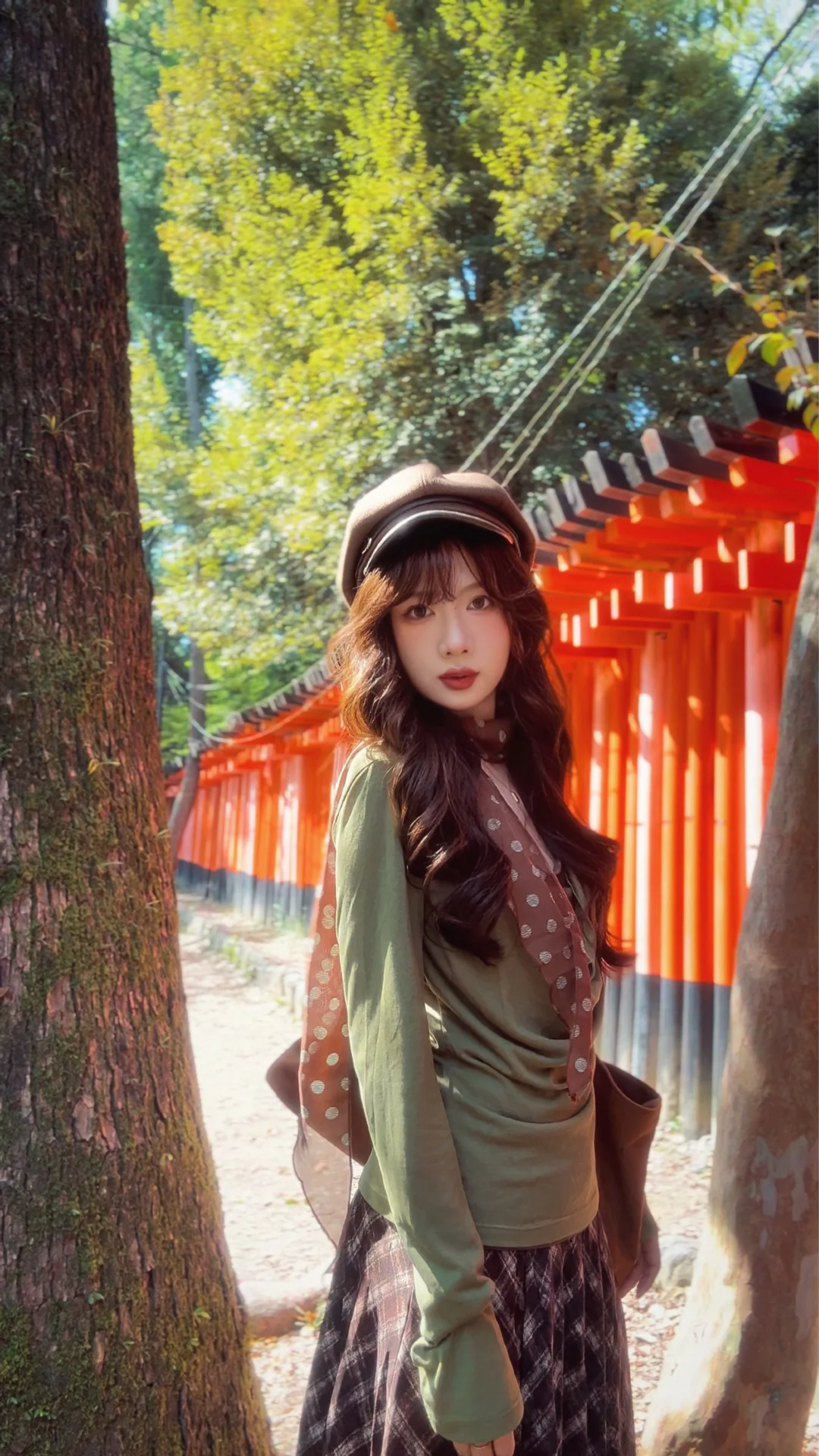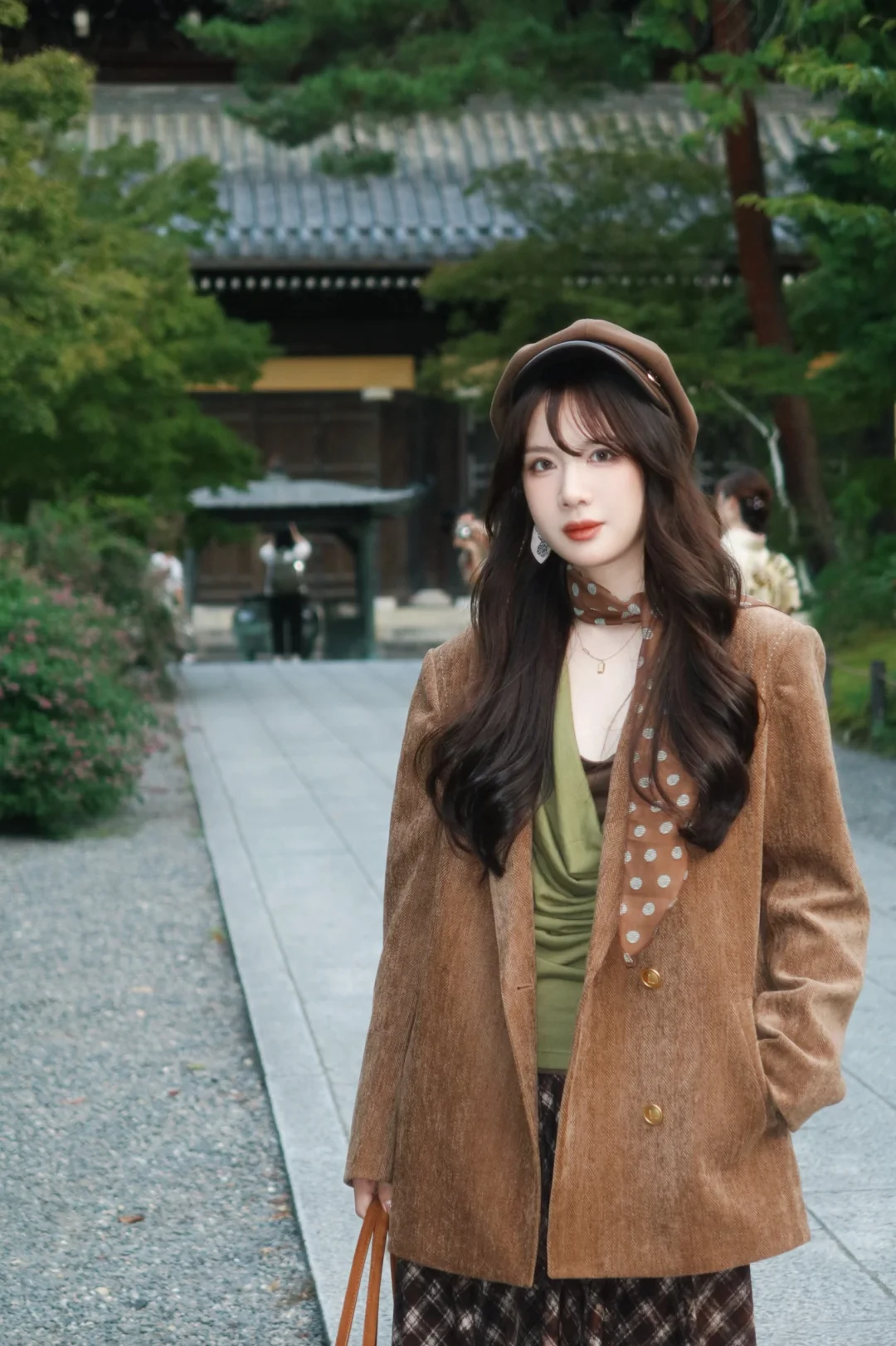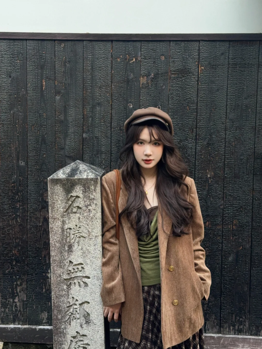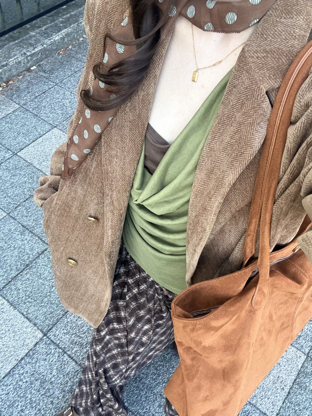 棕色外套➕绿色系内搭➕棕色格子裙 很复古~