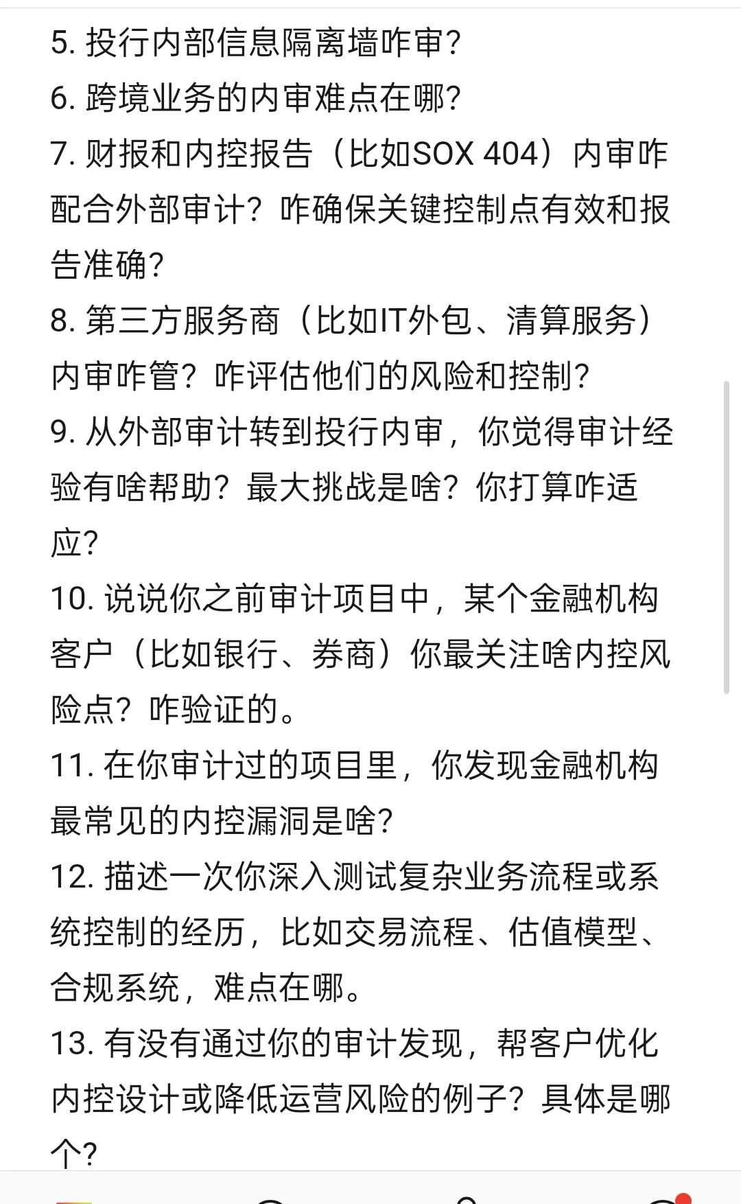 9. 从外部审计转到投行内审,你觉得审计经验有啥帮助?最大挑战是啥?你打算咋适应?