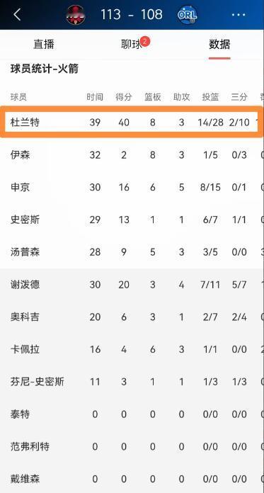 火箭巨星杜兰特真是狠狠地打肿了我的脸!在今天火箭客场以113:108击败魔术的比赛中,37岁的杜兰特打出了极其精彩的表现,他在首发出战的39分钟里,投篮28中14,其中三分球10中2、罚球10中10狂砍40分,外加8篮板3助攻2抢断,他的场上正负值为+10。 北京时间2月27日,NBA常规赛,火箭客场挑战魔术,最终火箭成功击败对手,拿下三连胜。 这场比赛打得跌宕起伏,一开始火箭并不占优势,魔术在主场气势很足,靠着快速进攻和内线冲击,早早就取得了领先。 比赛开局,魔术就打出了不错的进攻势头,一步步把分差拉开,到了第三节的时候,火箭一度落后很多,看起来比赛快要失去悬念。 但就在这个时候,火箭突然发力,掀起了一波强势的反击,这波反击里,杜兰特的表现起到了关键作用。 37岁的杜兰特首发出场,几乎打满了整场比赛,全程都很专注,进攻的时候,他不管是中距离投篮,还是突破上篮,都很稳定,就算面对对手的针对性防守,也能找到机会得分。 防守端,他也没有松懈,积极拼抢篮板,偶尔还能完成抢断,给队友创造反击机会。 第三节的反击高潮中,杜兰特和替补球员谢泼德配合得很好,谢泼德连续命中三分带动气势,杜兰特则稳步输出,一点点帮球队追分,慢慢抹平了巨大的分差,甚至实现了反超,到了末节决战,双方比分咬得很紧,交替领先,场面十分激烈。 魔术这边靠着核心球员的连续得分,试图重新夺回主动权,关键时刻,杜兰特站了出来,连续得分帮球队追平比分,稳住了局势。 最后几分钟,队友们也纷纷发力,内线球员强打得分,谢泼德命中关键三分,彻底浇灭了魔术的反扑势头,杜兰特则在最后阶段稳稳得分,锁定了胜局。 这场比赛,杜兰特不仅带领球队完成大逆转,还达成了生涯重要的得分里程碑,成为NBA历史上第六位达成这一成就的球员。 作为一名37岁的老将,在客场作战、球队陷入困境的情况下,还能有这样稳定且出色的表现,确实让人意外。 整场比赛下来,杜兰特用实际表现证明了自己依旧是联盟顶级球星,不管是进攻端的输出,还是防守端的投入,都展现了巨星的担当。 火箭能完成逆转,拿下这场关键的客场胜利,杜兰特的发挥功不可没。 以上都是个人观点,对此您有什么不同的看法,可以在评论区留言讨论!!!
