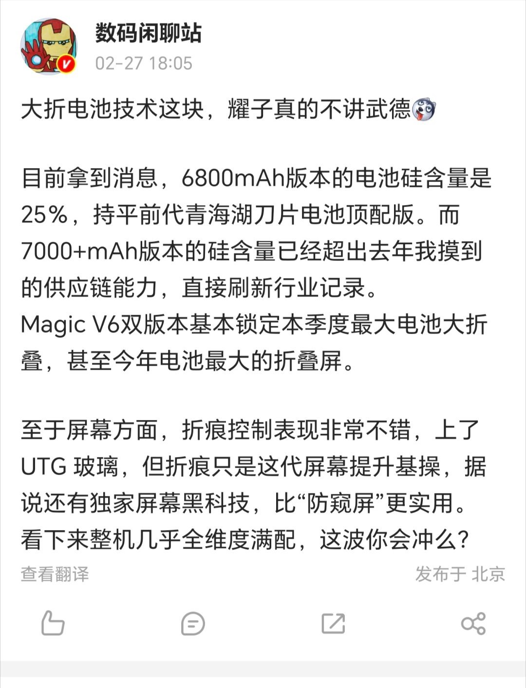 博主表示,这台手机的 7000mAh+ 版本硅含量更是已经超出“去年我摸到的供应链能力”,直接刷新行业记录。同时 Magic V6 双版本基本锁定本季度最大电池大折叠,甚至今年电池最大的折叠屏。