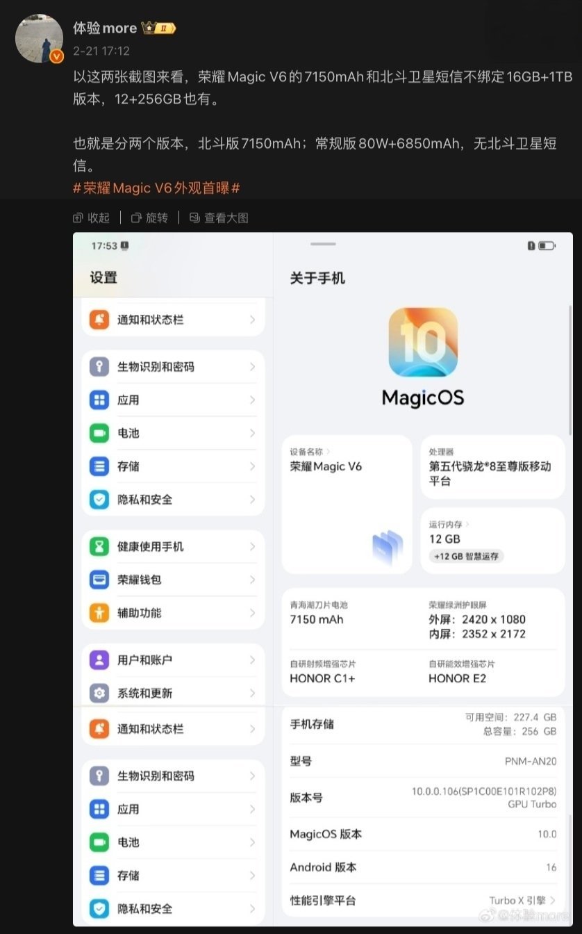 虽然博主并没有在文中点名这家厂商,荣耀 Magic V6 将拥有北斗版、常规版两种变体,前者搭载 7150mAh 电池,后者则是 6850mAh。容量和博主文中所述机型基本一致,因此可以合理推测为荣耀 Magic V6。