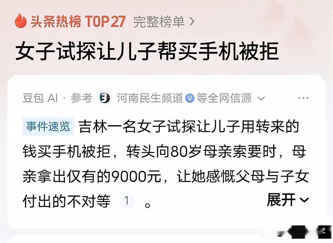 “可怜天下父母心!”吉林,女子收到儿子转的18000块钱,让她帮忙存起来,女子试探儿子问:我能拿这钱买个苹果17吗?儿子直摇头,拒绝道:不行,我好不容易攒的。下午,女子去80多岁的老母亲家,又试探说:妈,给我一万块钱,我想买手机。老母亲面露难色,说不太够啊。随后的做法却让女子瞬间泪目! 2026年2月26日,吉林长春,一名中年女子在家中收到了在外工作的儿子转账过来的一万八千元,儿子特意叮嘱母亲,这笔钱是自己工作之余省吃俭用攒下的积蓄,希望母亲帮忙妥善保管,避免自己随意花销,也为日后的生活与工作提前做好储备。 女子看着手机里的转账金额,心里泛起一丝暖意,同时也萌生了一个简单试探的想法,想要看看儿子对于自己辛苦攒下的钱,会有怎样的态度。 她借着闲聊的契机,向儿子表达想要动用这笔钱款,购置一款新款智能手机的想法,全程语气轻松,只是单纯的日常试探。 儿子得知想法后,态度十分明确,直接拒绝了这一请求,内心十分在意这笔积攒许久的资金,不愿轻易用于额外的消费支出,女子看着儿子的反应,内心没有丝毫不悦,只是默默记下了这一细节。 当天下午,女子收拾好随身物品,驱车前往年迈母亲的家中,老人已经八十多岁,独自居住在老旧小区里,生活简朴,平日里省吃俭用,所有积蓄都是多年省下来的养老钱,数额并不充裕。 女子进门后陪老人闲聊家常,聊起生活琐事与日常开销,气氛十分温馨,随后她再次延续上午的试探想法,向母亲提出需要一万元现金,用于购置智能手机的请求,想要看看年迈的母亲会做出怎样的回应。 老人听完女儿的需求后,脸上露出些许为难的神色,老人清楚自己的养老存款总额有限,日常买药、生活开支都需要从中支出,一次性拿出一万元,会让本就不多的积蓄所剩无几,甚至会影响后续的基本生活保障。 短暂思索后,老人没有丝毫推脱与犹豫,缓缓起身走到卧室,从衣柜深处的老旧木盒中,拿出包裹得严严实实的存款,里面有整沓的纸币,也有零散的零钱,都是老人一点点积攒下来的养老费用。 老人仔细清点着手中的钱款,将自己全部可用的现金尽数整理出来,即便总额并未达到一万元,也依旧把所有能拿出的钱全部递到女儿手中, 没有保留分毫,全程没有询问钱款用途,没有计较自身后续的生活开销,只想着满足女儿提出的需求,不愿让女儿受一点委屈。 女子接过老人递来的全部钱款,看着老人布满皱纹的双手与朴实的神情,再联想到上午儿子拒绝动用积蓄的反应,内心瞬间被强烈的情绪包裹,眼眶瞬间湿润,心底涌上难以言说的触动与酸涩。 同样是面对亲人的钱款请求,晚辈会顾及自身的辛苦付出与积蓄规划,而年迈的父母即便自身能力有限、生活拮据,也会倾尽所有满足孩子的需求,把孩子的需求放在首位,全然不顾自己的生活保障。 女子站在原地久久没有说话,静静感受着这份毫无保留的母爱,内心满是感慨,也真切体会到亲情里不同身份带来的截然不同的付出方式。 这段真实的生活片段被女子记录下来分享到网络,没有刻意修饰,没有煽情渲染,仅凭最真实的生活细节与情感对比,触动了无数网友的内心,让大家真切感受到父母对子女毫无保留的偏爱与付出。 对此,你们有什么看法,欢迎评论留言~