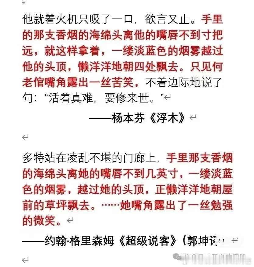 约翰·格里森姆笔下“一缕淡蓝色的烟雾,越过她的头顶,懒洋洋地朝屋前的草坪飘去”,到了她的《浮木》里,就成了“一楼淡蓝色的烟雾越过他的头顶,懒洋洋地朝四处飘去”。