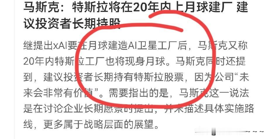 就在刚刚, 马斯克说了一个伟大的令人咋舌的梦想!令我汗毛都竖起来了! 他说,20年内在月球上建特斯拉工厂,建议投资者长期持股。 看完马斯克的梦想,咱们普通人真搞不明白,也想不通,月球上建厂成本不高吗?生产的特斯拉会便宜? 你在月球上建造城市还没建起来?还怎么建厂?连人还没上去呢?难道是用你的人形机器人? 看了一下特斯拉股票,市盈率都400多了,年报季度报连年下降,在还建议投资者长期持股,看不懂! 当然了,马斯克今年都56岁了,还能有20年之内的梦想,也确实不容易,但愿不是给投资者画了一个大饼。