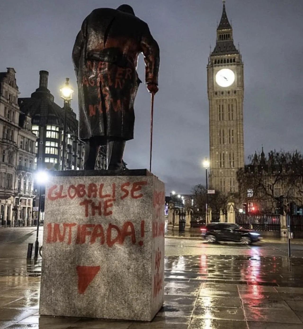 英国伦敦议会广场外的丘吉尔雕像被亲巴勒斯坦抗议人士喷上了红油漆。但是,亲巴勒斯坦跟丘吉尔有什么关系? 英国的堕落速度堪称欧洲最快,没有之一。