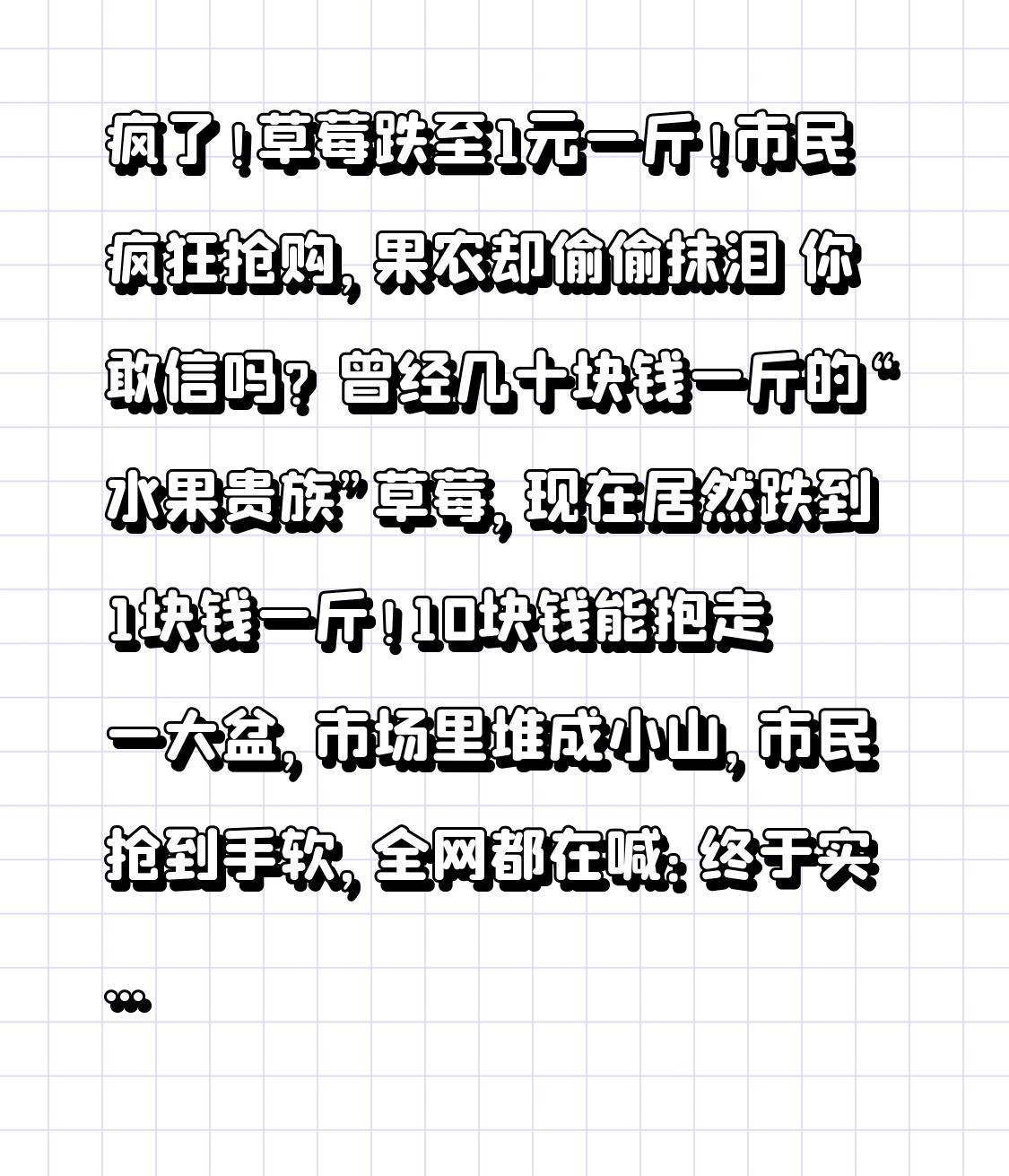 疯了!草莓跌至1元一斤!市民疯狂抢购,果农却偷偷抹泪 你敢信吗?曾经几十块钱一斤的“水果贵族”草莓,现在居然跌到1块钱一斤!10块钱能抱走一大盆,市场里堆成小山,市民抢到手软,全网都在喊:终于实现草莓自由! 年前还卖20多一斤的红颜草莓,现在好品相也就5块钱;普通小果直接按“地板价”1元甩卖,商贩一上午能卖三四千斤,有人一开单就是2300块,面包车拉货都装不下。大家一边捡便宜,一边感叹:这价格,做梦都不敢想! 可热闹背后,藏着没人愿意说的心酸。为啥突然这么便宜?根本不是品质变差,而是丰产撞上阴雨天,供大于求逼出来的无奈。暖冬让草莓提前扎堆成熟,全国产区集中上市,产量暴增;偏偏连日阴雨,市民不愿出门,草莓放两天就烂,果农和商贩只能亏本清仓,能卖一点是一点,总比烂在地里强。 更扎心的是,产地收购价低到七八毛钱,去掉大棚、肥料、人工成本,很多农户忙活一年,不赚反亏。他们看着熟透的草莓卖不上价,嘴上不说,心里全是苦。我们吃到的每一口便宜甜,都是他们在默默扛着损失。 有人说,市场经济涨跌很正常。可别忘了,每一颗低价草莓,都是农民面朝黄土背朝天的汗水;我们随手买的快乐,是他们一季的期盼。价格狂欢的两头,一头是市民的实惠,一头是农户的煎熬。 草莓甜,生活更要懂珍惜。下次买草莓时,多一句谢谢、少一分挑剔,尊重每一份辛苦付出。也愿风调雨顺,让勤劳的人,都能有个好收成!