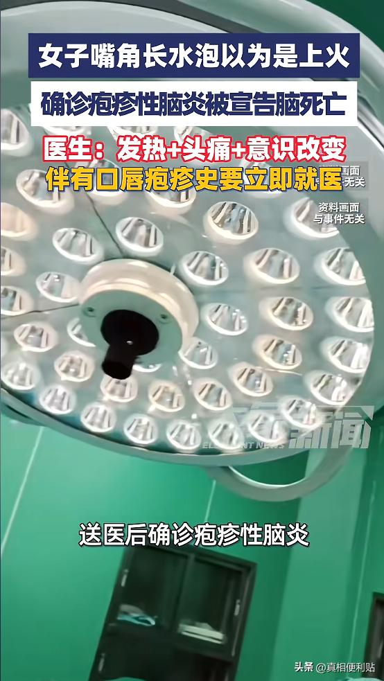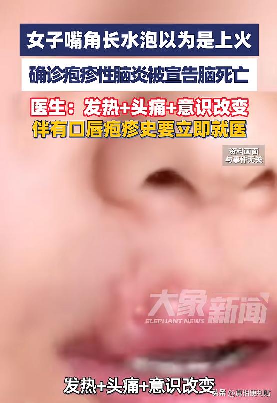 “悲剧还是发生了!”近日,陕西,一女子嘴角长了小水泡,以为是上火引起的“烂嘴角”,没放在心上,可涂药和喝凉茶都没效果,随后病情恶化,不仅面部麻木,还发起了高烧,送医后确诊为疱疹性脑炎,被医生宣告脑死亡!网友:太吓人了! 很多人都有过这样的经历:嘴角忽然起了个小水泡,微微发胀,有点刺痛,大多数情况下,抹点药、过几天就好了,很少有人会把它当成大事。 陕西一位三十多岁的餐馆老板张女士,最初也是这么想的,她平时忙着打理生意,从备菜、采购到招呼客人几乎都亲力亲为,作息不规律是常态。 那天照镜子时,她发现嘴唇边缘冒出一个米粒大小的水疱,没有发烧,也没有明显不适,她以为只是最近熬夜上火,简单处理后继续工作。 但几天过去,情况没有像以往那样自行好转,水疱变大,局部肿胀明显,还伴随面部一侧发麻。 因为没有剧烈疼痛,她并未立刻就医,只是觉得可能是太累,直到后来出现高烧、持续性头痛和频繁呕吐,家人这才意识到事情不对,把她送往医院。 检查结果显示为疱疹性脑炎,这是一种由单纯疱疹病毒,引发的严重中枢神经系统感染。 单纯疱疹病毒在成年人中的感染率并不低,很多人小时候就已经感染,病毒平时潜伏在神经节内,当人体免疫力下降时可能被激活。 多数情况下,它只会引起唇部疱疹,几天后自行缓解,但极少数情况下,病毒可能沿神经向中枢传播,侵犯脑组织。 疱疹性脑炎的特点是起病急、进展快,常见症状包括高热、剧烈头痛、精神状态改变、嗜睡甚至抽搐。 医学上强调尽早使用抗病毒药物,尤其是在症状出现后的前两天内及时治疗,对预后影响很大,一旦延误,脑组织可能出现不可逆损伤。 据家属回忆,从出现水疱到明显神经系统症状之间,有一个逐渐加重的过程,但由于最初症状轻微,加上工作繁忙,张女士没有把这些变化联系起来,等到送医时,病情已经十分危重。 类似病例虽然并不常见,但确实存在,它提醒人们,身体发出的信号,有时并非简单的“上火”或“劳累”。 特别是在长期熬夜、压力大、免疫力下降的情况下,一些原本温和的病毒,可能变得更具攻击性。 当然,也不必因此对每一次口唇疱疹都过度恐慌,绝大多数唇疱疹只局限于局部皮肤,不会发展为严重感染。 关键在于观察是否出现异常情况,例如,高热持续不退、明显头痛、意识模糊、反应迟钝、言语不清等症状,都提示可能涉及中枢神经系统,需要尽快就医。 在日常生活中,保持规律作息、减少长期熬夜、均衡饮食,有助于维持免疫系统稳定,对于反复发作的唇疱疹患者,也可以在医生指导下进行规范治疗,而不是单纯依赖偏方或自行用药。 张女士的经历令人惋惜,她原本只是想把生意做好,把日子过稳,却忽视了身体的变化,很多人都会在忙碌中选择“再等等”“应该没事”,但医学问题往往不以主观判断为转移。 当身体出现与以往不同的症状时,尤其是伴随发热和神经系统异常表现,及时就医比自行判断更安全。 哪怕最终只是普通感染,也能通过检查排除风险,对健康的重视,并不是小题大做,而是在关键时刻为自己争取时间。 信息来源:《女子嘴角长小水泡以为是上火,结果确诊疱疹性脑炎被宣告脑死亡》大象新闻