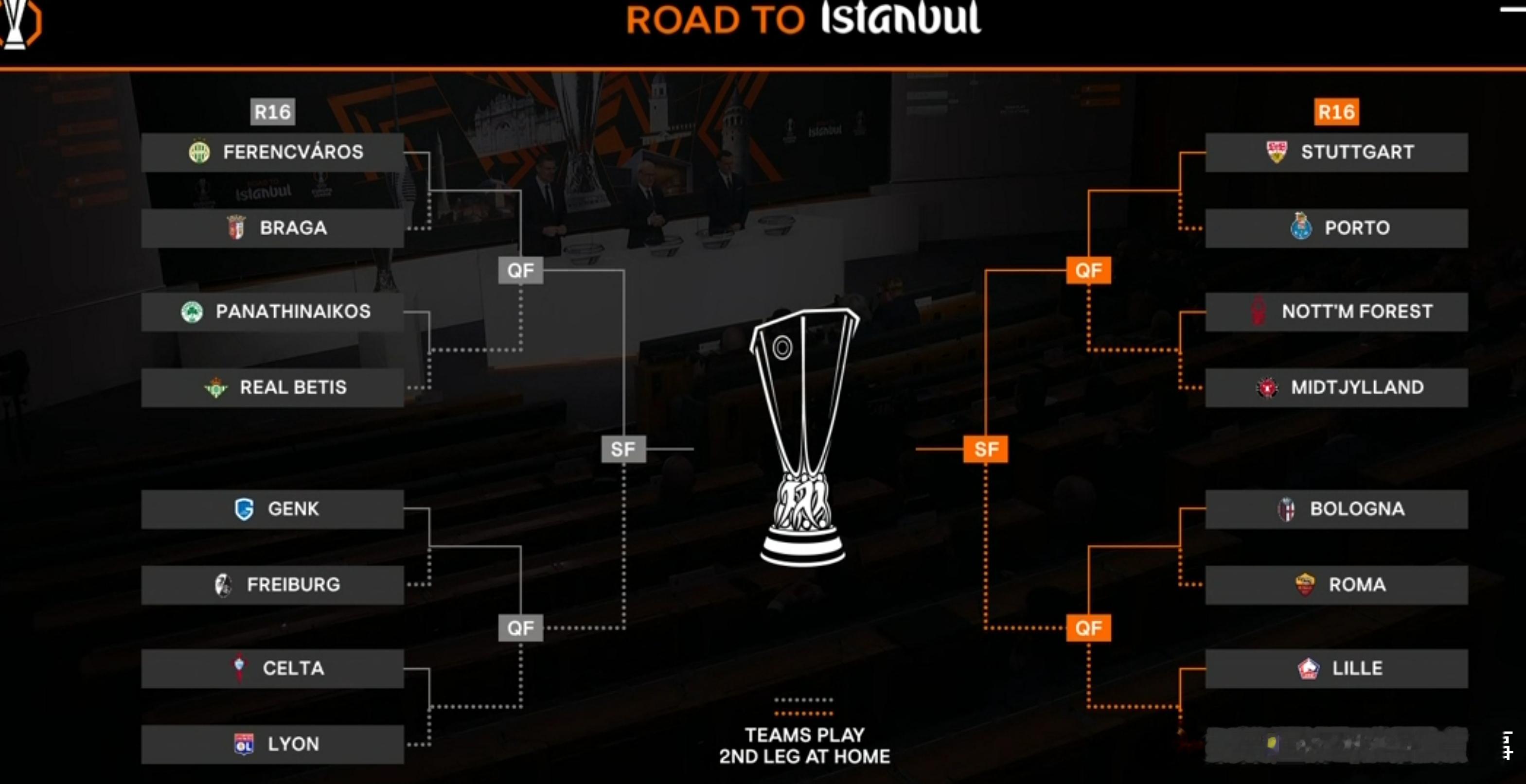 亨克 vs 弗赖堡博洛尼亚 vs 罗马费伦茨瓦罗斯vs 布拉加斯图加特 vs 波尔图帕纳辛纳科斯 vs 皇家贝蒂斯诺丁汉森林 vs 中日德兰塞尔塔 vs 里昂里尔 vs 维拉