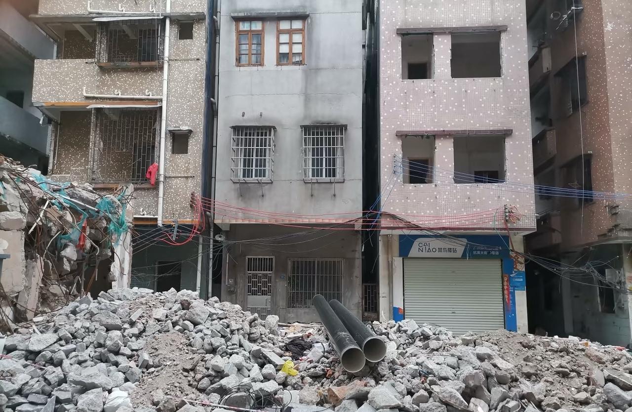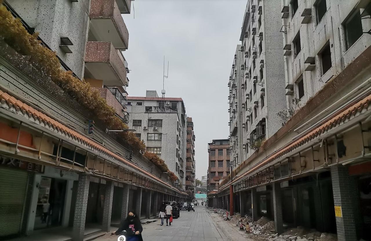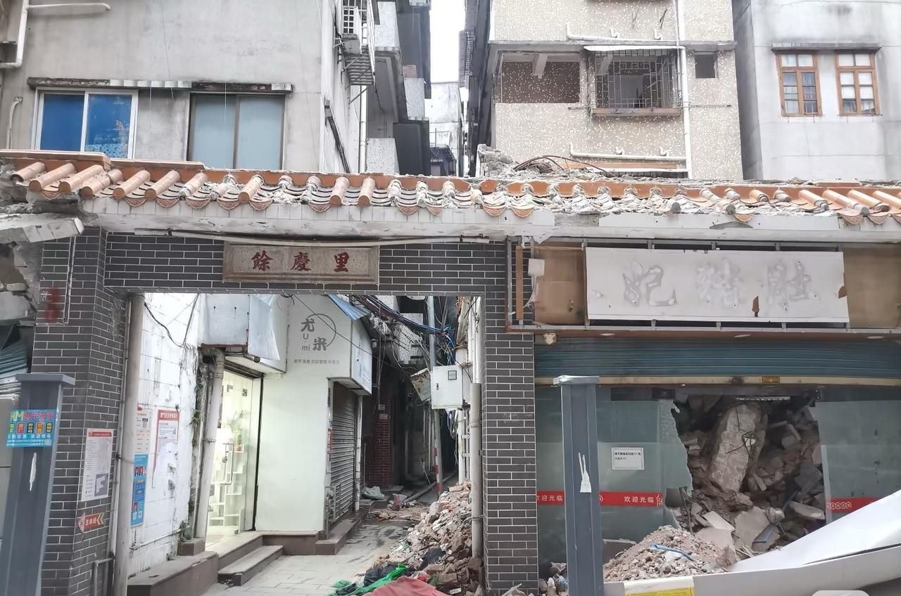 三元里抗英大街现状 目前抗英大街两侧基本看不到完整的建筑,堆积如山的建筑废料用绿色盖土网包裹防止扬尘。 图二为榕荫园 图三为抗英大街骑楼区域 图五为旧村改造项目最新公告 图六为餘庆里住宅区牌坊