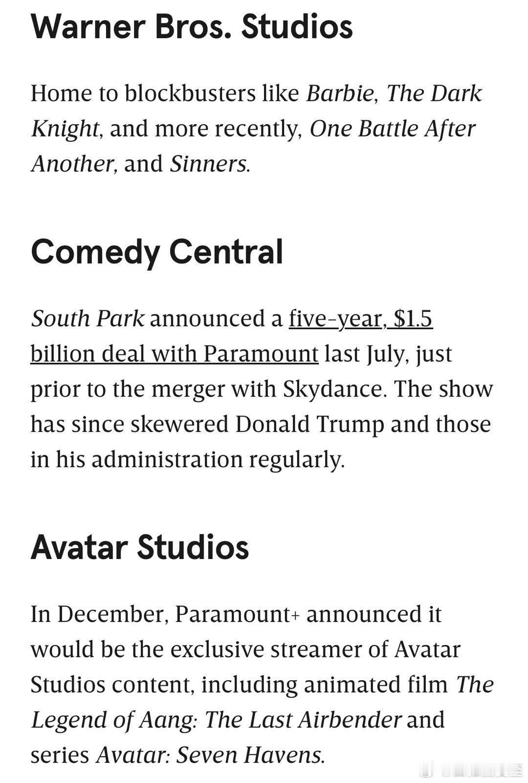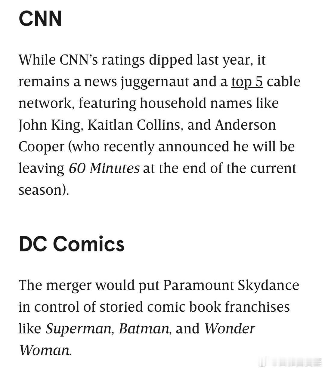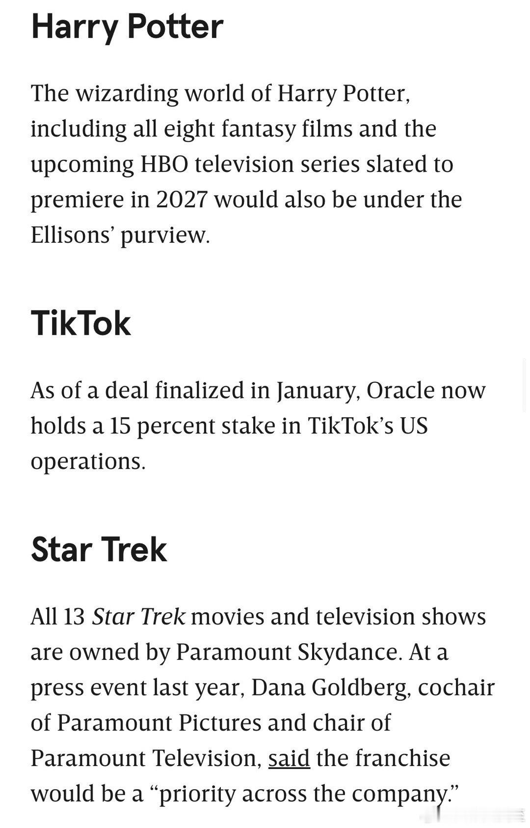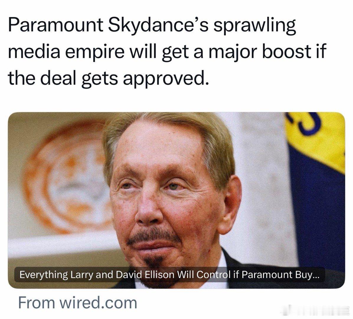 如果Paramount收购华纳成功,Ellison父子将控制:CBS、CNN、HBO、DC Comics(超人、蝙蝠侠等)、Harry Potter、Star Trek、华纳兄弟、Comedy Central、Avatar、Mission Impossible、Lord of the Rings、HGTV、Food Network、Discovery、Showtime…等等
