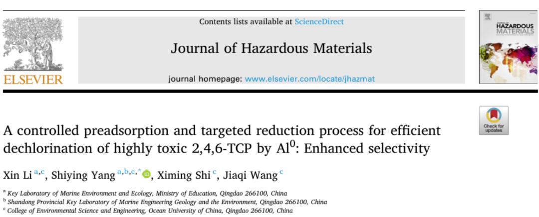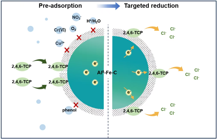 近日,中国海洋大学环境科学与工程学院杨世迎教授研究团队在环境领域著名学术期刊JournalofHazardousMaterials上发表了题为“Acontrolledpreadsorptionandtargetedreductionprocessforefficientdechlorinationofhighlytoxic2,4,6-TCPbyAl0:Enhancedselectivity”的研究论文。该研究开发了一种新型的铝-铁-碳复合材料(Al0-Fe-C),通过FeSO4·7H2O的破膜作用和CNTs的电子导向作用能够有效提高微米零价铝的反应活性,同时可以通过“预吸附-电子靶向传递-还原脱氯”的反应过程实现高效的电子选择性,实现废水中高毒性及高疏水性的有机污染物的靶向降解。