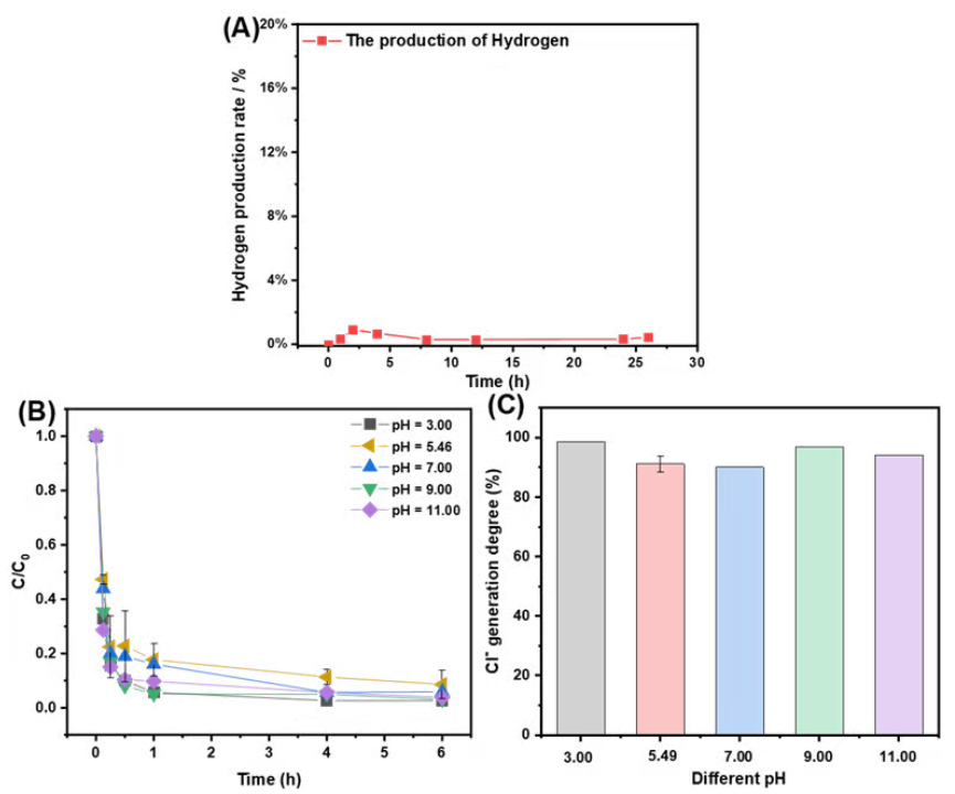 图4:(A)氢气生成实验;不同pH值对(B)降解程度和(C)脱氯程度的影响。