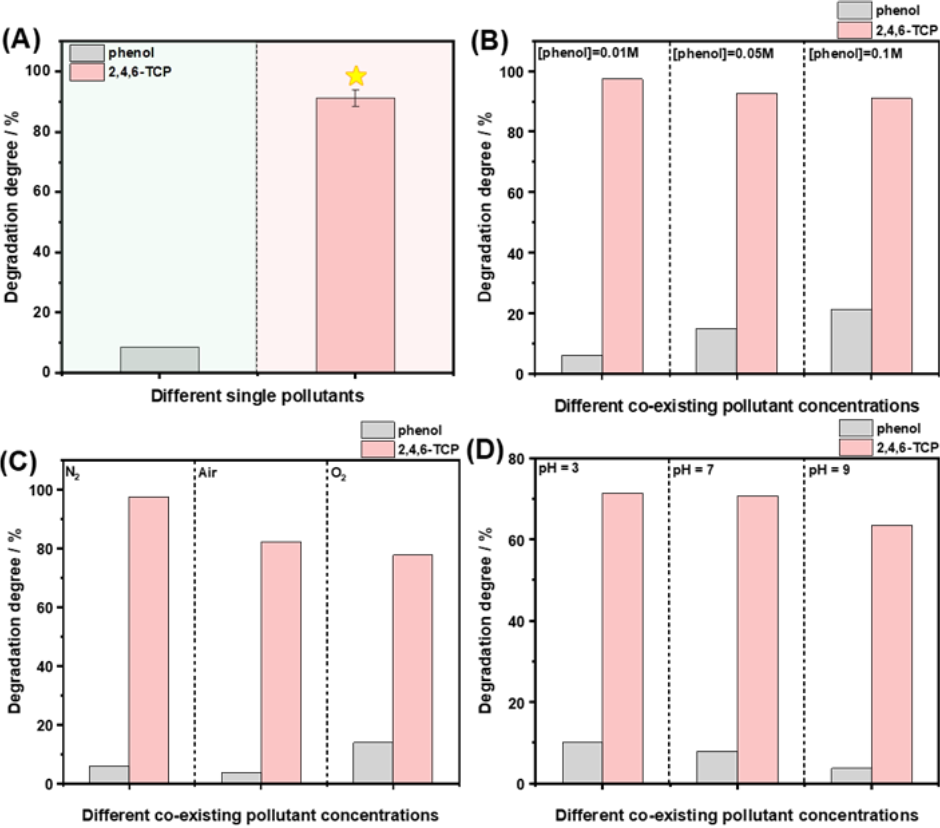 图6:(A)在相同浓度下不同氯酚的单独降解;苯酚与三氯酚共存对氯酚污染物降解的影响:(B)共存苯酚浓度的影响;(C)反应环境的影响;(D)pH值的影响。