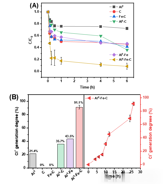 图1:(A)不同反应体系中2,4,6-三氯酚的降解性能;(B)不同材料在24小时内的脱氯效率以及Al0-Fe-C的脱氯曲线。