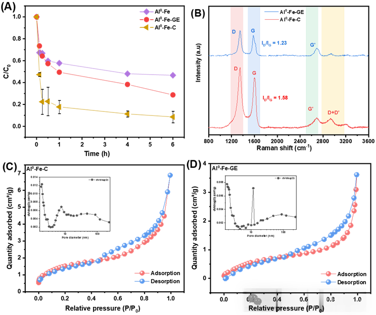 图3:(A)不同碳类型下的降解效率;(B)不同类型的碳材料的拉曼光谱;(C)和(D)不同类型的碳材料的吸附曲线及孔径分布。